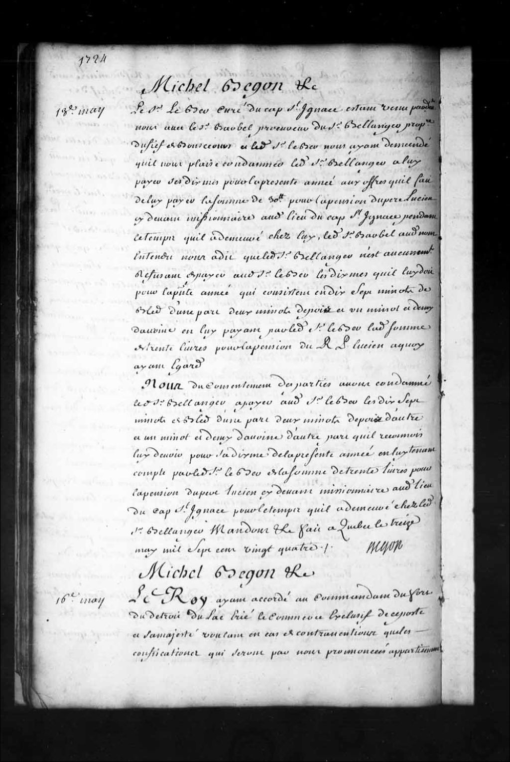 Commission de subdélégué de l'intendant à l'aumônier du poste de Détroit par l'intendant Bégon pour accompagner les commis et préposés aux visites pour saisies de castor, marchandises étrangères, etc, 16 mai 1724, Archives nationales à Québec, Fonds Intendants, (03Q,E1,S1,D10,P1599).
