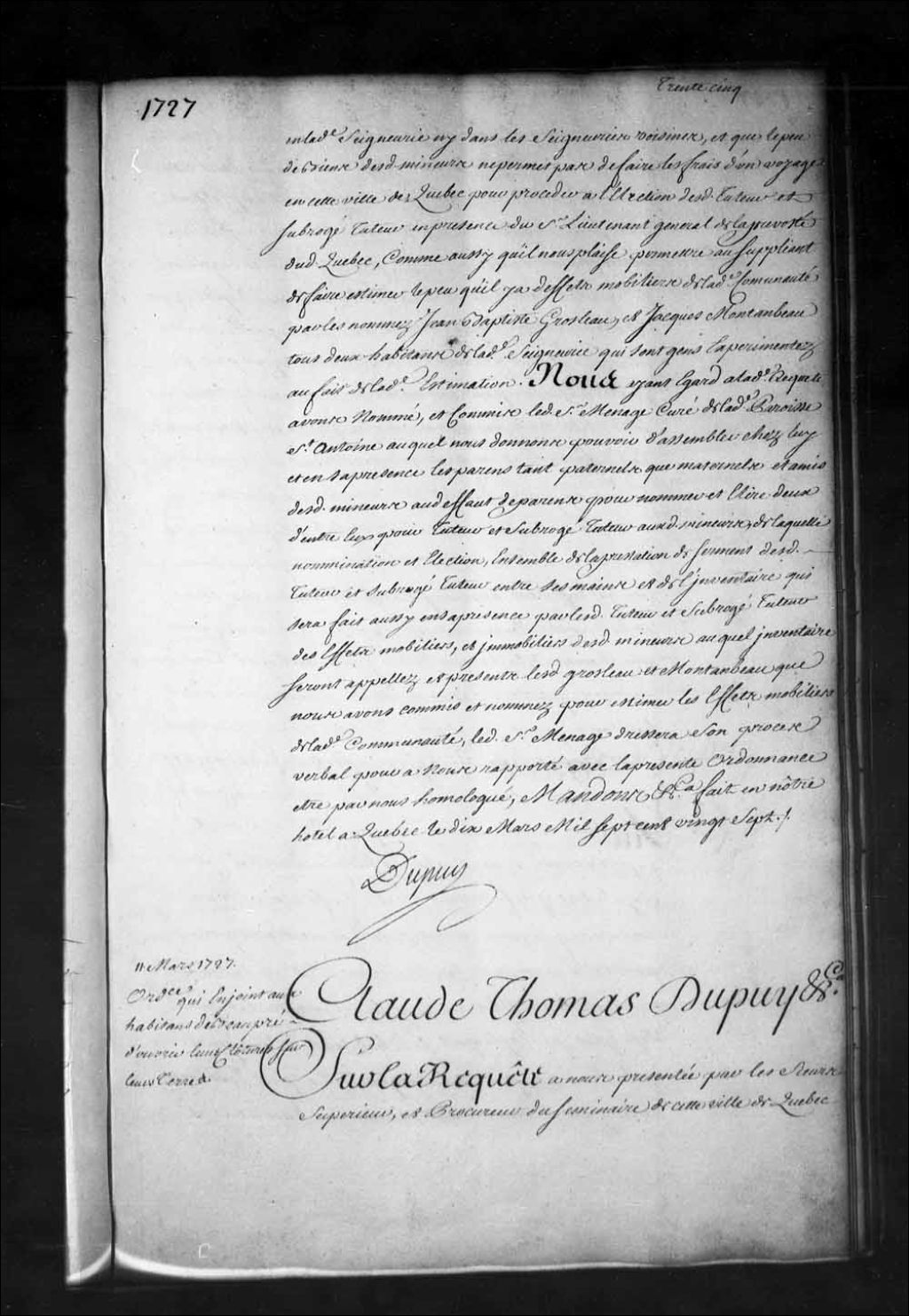 Ordonnance de l'intendant Dupuy qui enjoint aux habitants de Beaupré d'ouvrir les clôtures sur leurs terres afin de faire un chemin de la largeur de dix pieds dans toute sa longueur, commençant au moulin du Petit-Pré et finissant à l'église de L'Ange-Gardien, et s'il est nécessaire jusqu'au saut de Montmorency, et ce jusqu'à ce que le chemin royal soit parfaitement rétabli, 11 mars 1727, Archives nationales à Québec, Fonds Intendants, (03Q,E1,S1,D12A,P1810).