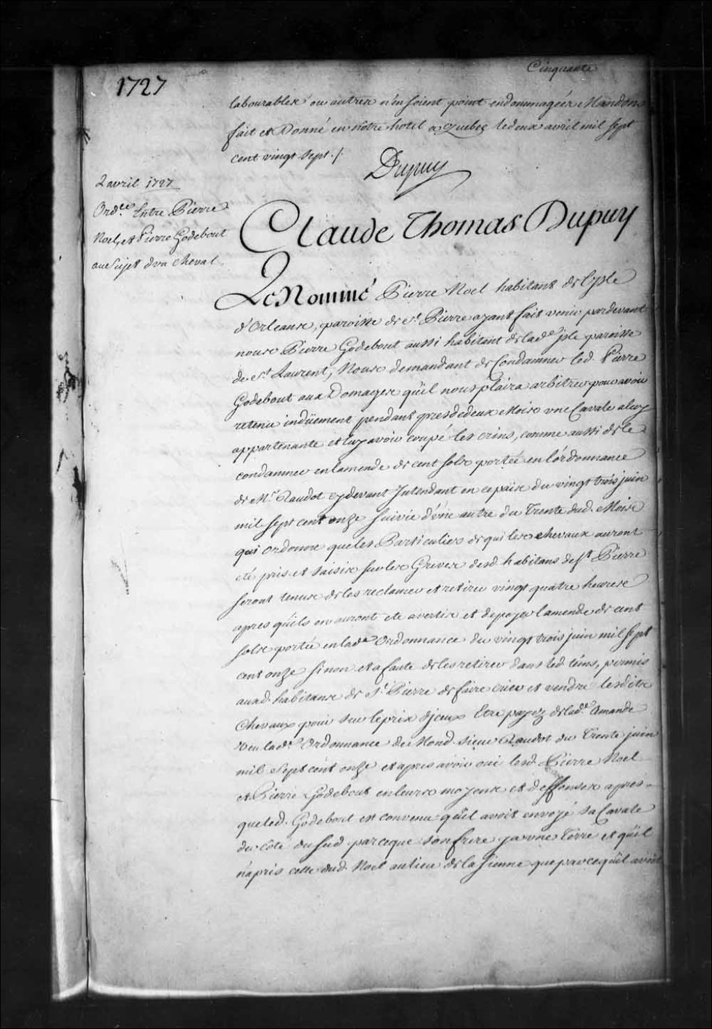 Ordonnance de l'intendant Dupuy qui condamne Pierre Godbout, habitant de Saint-Pierre de l'île d'Orléans, à une amende de cent sols pour avoir, au mépris des ordonnances, retenu pendant près de deux mois la cavale (jument) de Pierre Noël, habitant du même lieu, et à dix livres de dommages pour le tort causé audit Noël, 2 avril 1727, Archives nationales à Québec, Fonds Intendants, (03Q,E1,S1,D12A,P1824).