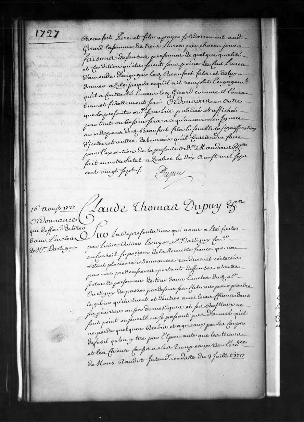 Ordonnance de l'intendant Dupuy qui fait défense à toutes sortes de personnes d'entrer dans l'enclos de Louis Rouer d'Artigny, conseiller au Conseil supérieur, de passer par-dessus ses clôtures pour prendre le gibier abattu, d'entrer dans ses prairies et de les gâter à peine de dix livres d'amende et de confiscation des armes contre chacun des contrevenants, 16 août 1727, Archives nationales à Québec, Fonds Intendants, (03Q,E1,S1,D12A,P1907).
