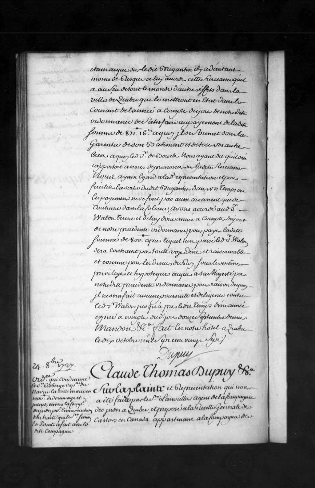 Ordonnance de l'intendant Dupuy qui condamne Denis Roberge, capitaine du navire "la Ville-Marie", en mille livres de dommages et intérêts envers la Compagnie des Indes pour avoir refusé de prendre à bord de son navire ce qui restait de la recette des castors pour la présente saison au mépris de la convention faite avec Simon Lapointe, négociant à La Rochelle, armateur de "la Ville-Marie", 24 octobre 1727, Archives nationales à Québec, Fonds Intendants, (03Q,E1,S1,D13,P1952).