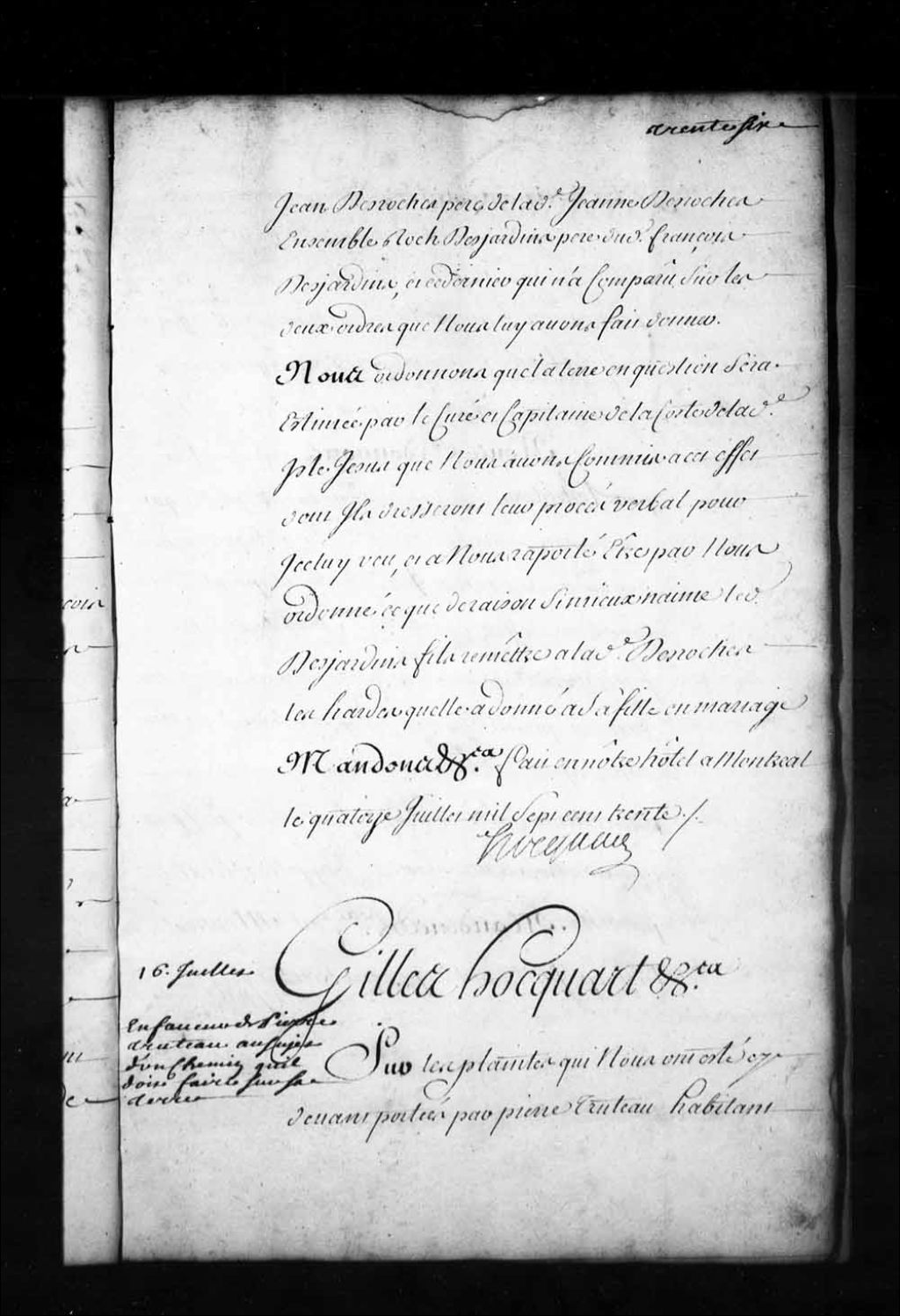 Ordonnance de Gilles Hocquart, faisant les fonctions d'intendant, qui porte qu'il sera fait sur la terre de Pierre Truteau (Trudeau), habitant de Lachenaie, pour l'utilité publique, un chemin de dix-huit pieds de large qui partira de sa maison et ira aboutir à la pointe de L’Assomption; défense à tous les habitants de Lachenaie, aussitôt que ledit chemin sera parachevé, de passer dans les prairies de Truteau (Trudeau) ni ailleurs sur sa terre comme aussi de rompre ses clôtures à peine de trois livres d'amende