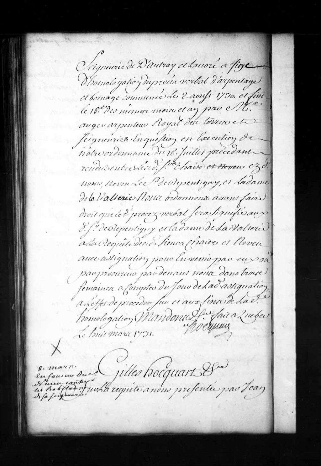 Ordonnance de l'intendant Hocquart qui, à la requête de Jean-Baptiste Neveu, seigneur de Dautré et de Lanoraie, condamne Gabriel Gilbert dit Lasonde, Gilles Gilbert, Antoine Gaudry, la veuve d'Augustin Lasablonnière (Brunet Lasablonière), François Lanctôt père, Jean Rochon, François Lonctôt fils, Dubuc, Jacques Cochon (Cauchon), habitants de Dautré, et les héritiers de Pierre Guinart (Guignard), Saint-Germain, Gasaille (Gazaille), Honoré, André Saint-André et Jean Gratiol (Gratiot, Graciot), habitants de Lanoraie, à tenir feu et lieu dans l'espace d'une année, à peine de réunion de leurs terres au domaine du sieur Neveu