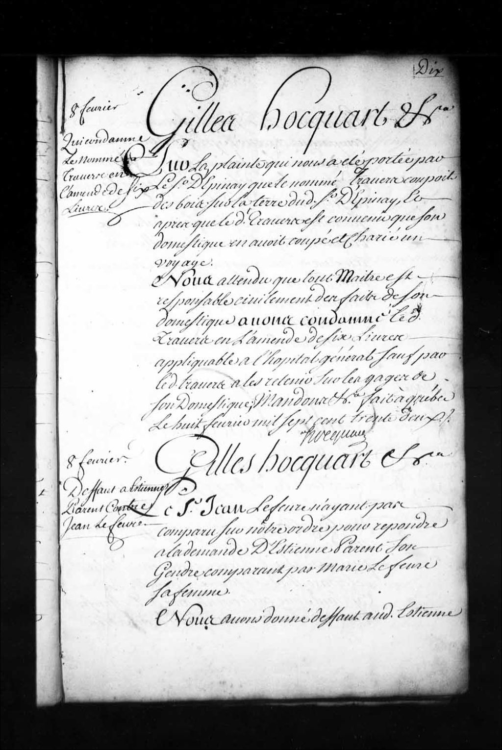 Ordonnance de l'intendant Hocquart qui, attendu que tout maître est responsable civilement des faits de son domestique, condamne le nommé Travers en l'amende de six livres parce que son domestique a coupé et charrié un voyage de bois pris sur la terre du sieur de Lespinay (Couillard de Lépinay, Lépiné), 8 février 1732, Archives nationales à Québec, Fonds Intendants, (03Q,E1,S1,D20,P2374).
