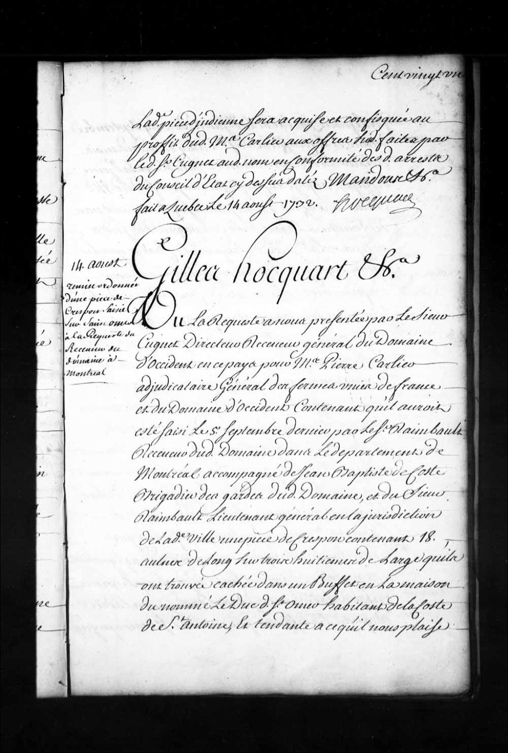 Ordonnance de l'intendant Hocquart qui donne mainlevée de la saisie d'une pièce de crépon de dix-huit aulnes de long sur trois huitièmes de large faite en la maison du nommé Leduc dit Saint-Omer, habitant de la côte Saint-Antoine, et décide que ladite pièce de crépon sera remise au sieur Leduc dit Saint-Omer, 14 août 1732, Archives nationales à Québec, Fonds Intendants, (03Q,E1,S1,D20,P2473).