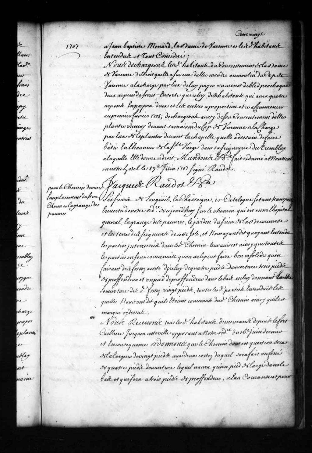 Ordonnance de l'intendant Jacques Raudot qui décide que le chemin projeté entre l'Hôpital général, la grange des pauvres, le jardin du sieur de la Découverte (Ladécouverte) et la terre des seigneurs, à Montréal, sera de la largeur de vingt pieds avec un fossé de chaque côté, et qui porte que tous les habitants qui ont des charrois depuis le fort Rolland tant de Lachine que des côtes de Saint-Pierre et Saint-Joseph, ensemble tous ceux qui ont des charrois dans la ville de Montréal, y contribueront de leurs charrois et de leur travail suivant la répartition qui en sera faite par le sieur de Catalogne