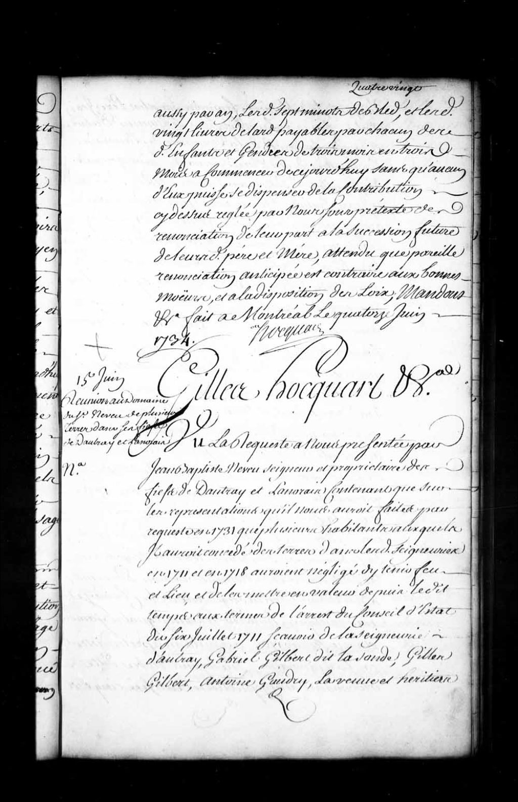Ordonnance de l'intendant Hocquart qui réunit au domaine de Jean-Baptiste Neveu, seigneur des fiefs de Dautré et Lanoraie, les terres de Gabriel Gilbert, Gilbert dit Lasonde, Gilles Gilbert, Antoine Gaudry, la veuve et héritiers d'Augustin Lasablonnière (Brunet Lasablonière), François Lanctôt père, Jean Rochon, François Lanctôt fils, Dubuc, Jacques Cochon (Cauchon), habitants de la seigneurie Dautray, et les héritiers de feu Pierre Guinart (Guignard), Saint-Germain dit Gazaille, Honoré André dit Saint-André, Jean Gratiot (Graciot), habitants de la seigneurie de Lanoraie, qui ne tiennent point feu et lieu