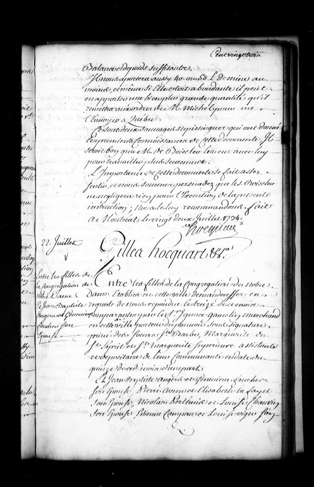 Ordonnance de l'intendant Hocquart entre les Filles de la Congrégation de Notre-Dame établies à Montréal et Jean-Baptiste Auger et Geneviève Faucher, son épouse, Pierre Saint-Cosme et Élisabeth Lafayet (Lafayette), son épouse, Nicolas Perthuis et Louise Chauvin, son épouse, Étienne Campeau et Louise Viger, son épouse, Jean-Baptiste Godefroy et Jeanne Grandmesnil (Veron), son épouse, propriétaires d'emplacements achetés desdites Filles, au sujet d'un mur qu'ils se sont obligés à construire à frais communs, 22 juillet 1734, Archives nationales à Québec, Fonds Intendants, (03Q,E1,S1,D22,P2692).