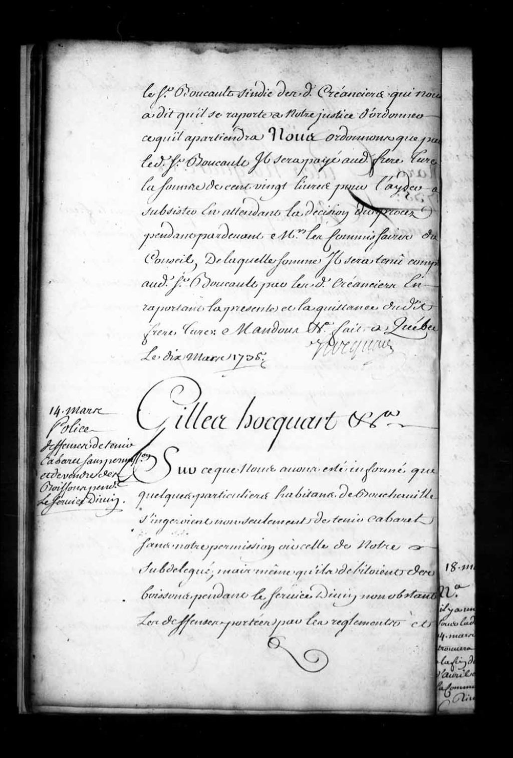 Ordonnance de l'intendant Hocquart qui fait défense aux habitants de Boucherville de tenir cabaret sans une permission de l'intendant ou de son subdélégué; défense à tous cabaretiers aubergistes dudit lieu de vendre et débiter des boissons pendant le service divin à peine de dix livres d'amende, 14 mars 1735, Archives nationales à Québec, Fonds Intendants, (03Q,E1,S1,D23,P2726).