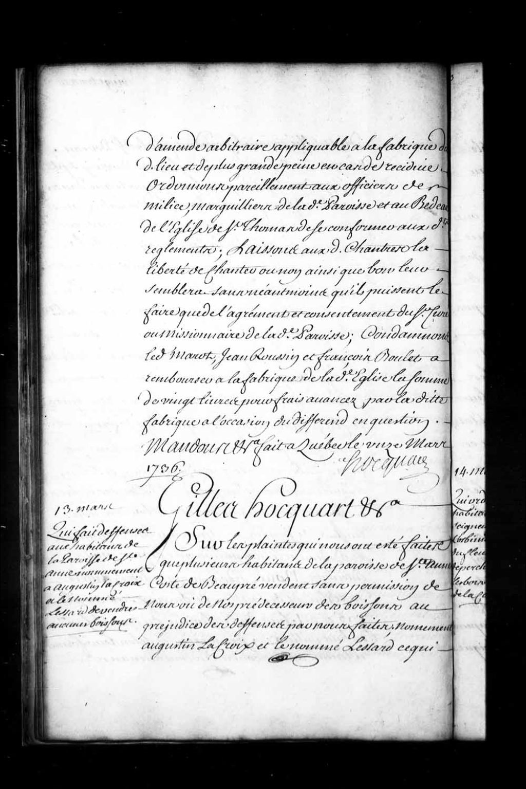Ordonnance de l'intendant Hocquart qui fait défense aux habitants de Sainte-Anne de la Côte-de-Beaupré, nommément à Augustin Lacroix et au nommé Lessard, de vendre et débiter aucunes boissons sous les peines portées par les règlements et Ordonnance de l'intendant Hocquarts concernant les cabarets, 13 mars 1736, Archives nationales à Québec, Fonds Intendants, (03Q,E1,S1,D24,P2804).