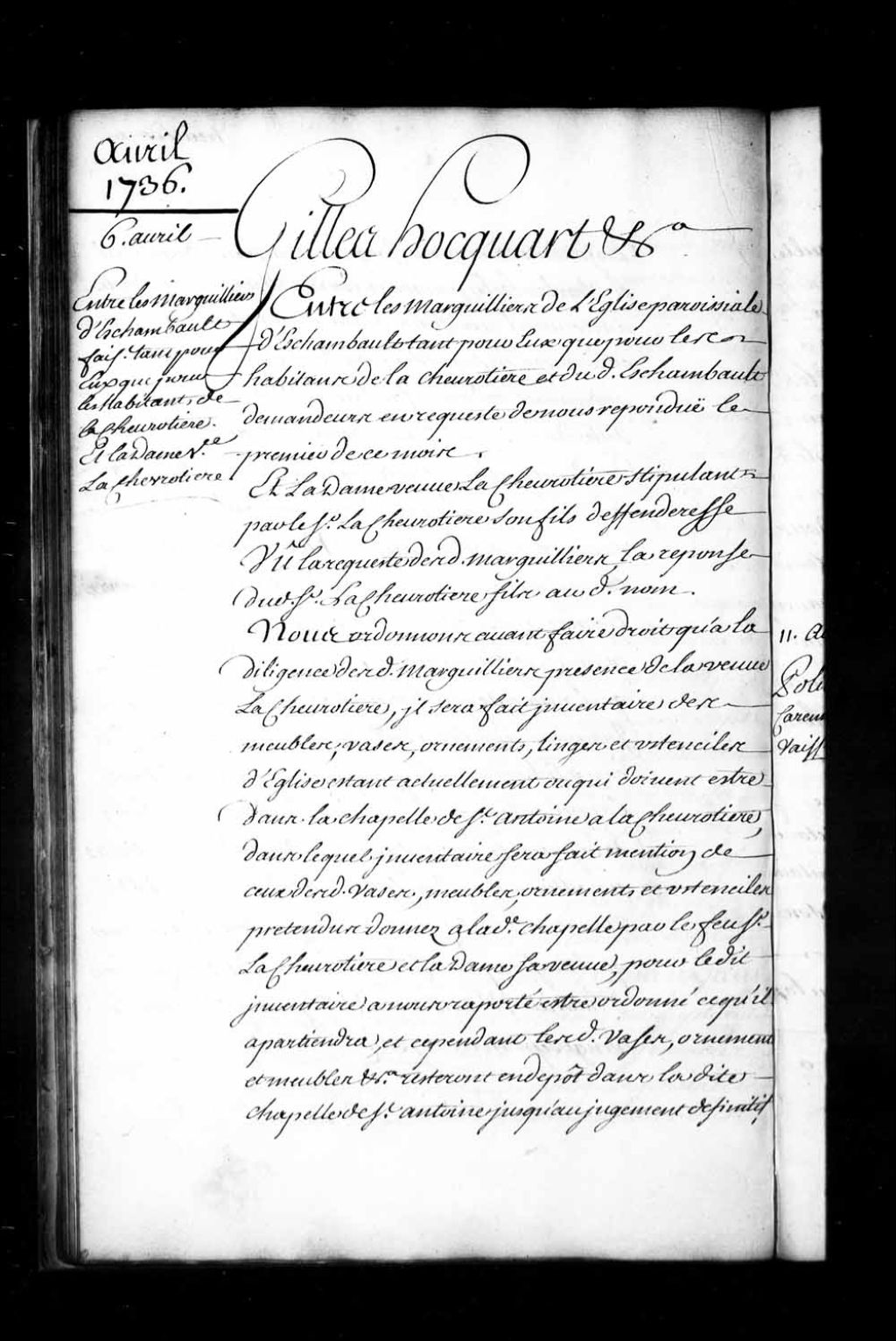 Ordonnance de l'intendant Hocquart qui, avant faire droit dans le différend entre les marguilliers de l'église paroissiale de Deschambault et la dame veuve de la Chevrotière (Chavigny de Lachevrotière), décide qu'il sera fait un inventaire des meubles, vases, ornements, linges et ustensiles d'église qui sont actuellement ou qui doivent être dans la chapelle de Saint-Antoine à la Chevrotière dans lequel inventaire sera fait mention de ceux desdits vases, meubles, ornements et ustensiles donnés à ladite chapelle par le feu sieur de la Chevrotière et la dame sa veuve, pour ledit inventaire rapporté à l'intendant être ordonné ce qu'il appartiendra; les vases, ornements, meubles, etc., resteront en dépôt dans ladite chapelle de Saint-Antoine jusqu'au jugement définitif
