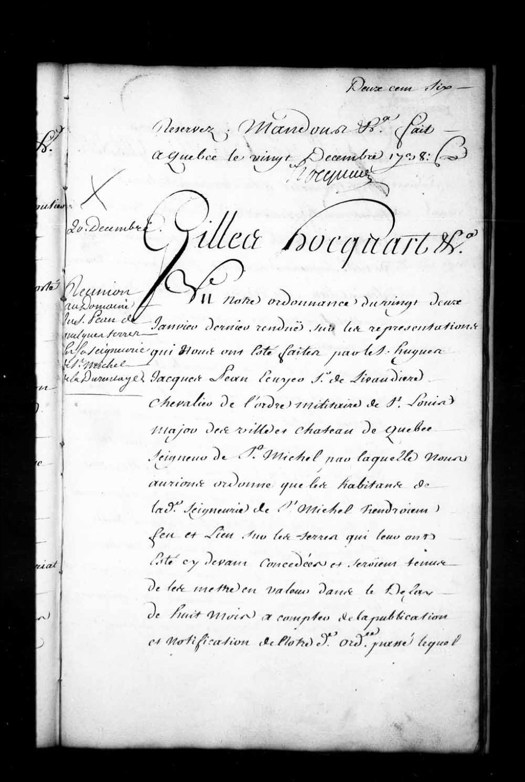 Ordonnance de l'intendant Hocquart qui réunit au domaine de Hugues-Jacques Péan de Livaudière, chevalier de Saint-Louis, major des ville et château de Québec, seigneur de Saint-Michel, les terres de Jean Vallière, Augustin Boulet (Boulé, Boulay), le nommé Fontaine, le nommé Rouleau, Nicolas Chamberlan, Pierre Mercier, Jean-Baptiste Dupont, Joseph Fougère (Fugère), Étienne Lessard, Pierre Bernier, Jacques Surcelier, Joseph Beaudoin (Baudouin) et Antoine Guéret (Quéret, Quérette) dit Latulippe, habitants de ladite seigneurie qui ne tiennent pas feu et lieu et n'ont pas mis leurs terres en valeur dans le temps prescrit par l'arrêt du Conseil d'État du Roi et l'ordonnance du 22 janvier 1738