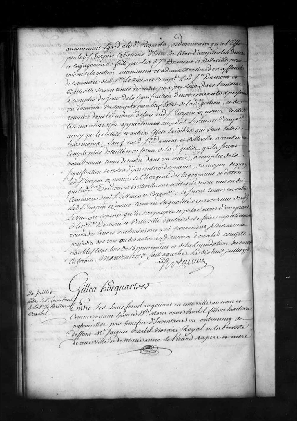 Ordonnance de l'intendant Hocquart entre Louis Fornel (Fournel) négociant à Québec, au nom et comme ayant épousé Marie-Anne Barbel, fille et héritière présomptive par bénéfice d'inventaire de défunt Jacques Barbel, notaire royal, et de Marie-Anne Lepicard, sa femme, et Jacques Barbel, François Barbel, etc., au sujet de la succession dudit Jacques Barbel, 20 juillet 1741, Archives nationales à Québec, Fonds Intendants, (03Q,E1,S1,D29,P3347).