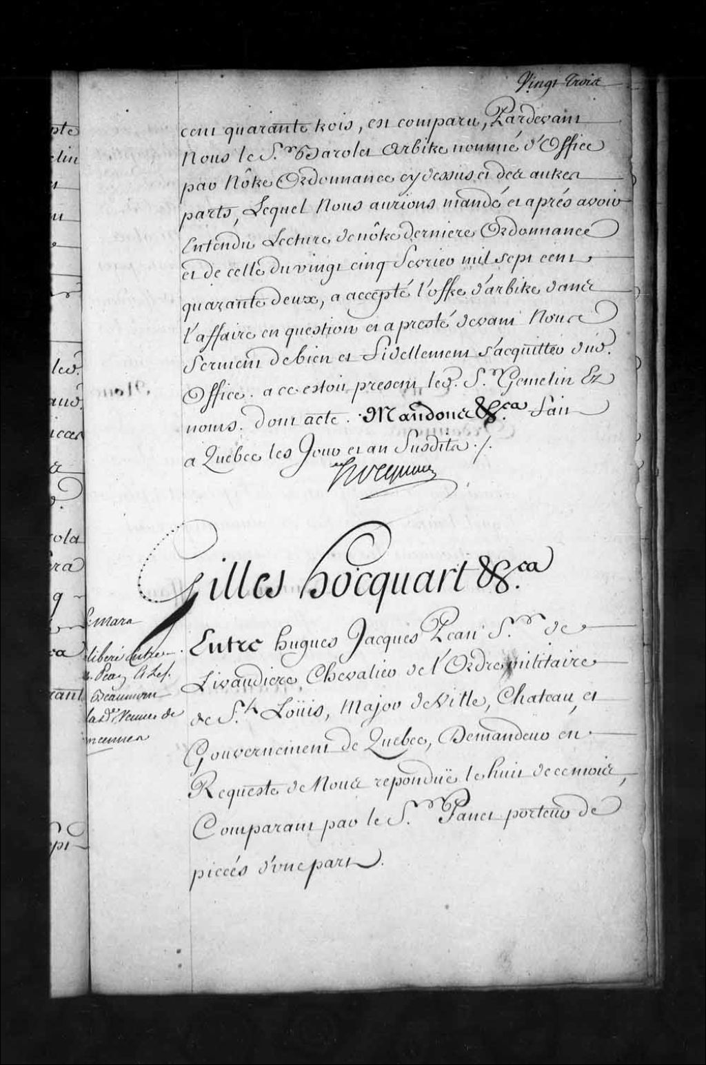 Ordonnance de délibéré par l'intendant Hocquart entre Hugues-Jacques Péan de Livaudière, chevalier de Saint-Louis, major des ville, château et gouvernement de Québec, Charles Couillard, seigneur de Beaumont, et Marguerite Forestier, veuve de Jean-Baptiste Bissot de Vincennes, et Noël Beaupré, arpenteur, 16 mars 1743, Archives nationales à Québec, Fonds Intendants, (03Q,E1,S1,D31,P3481).
