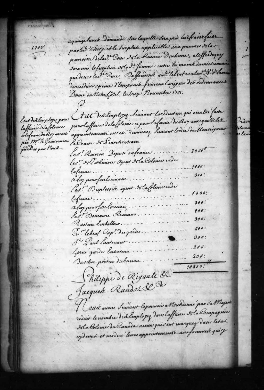 État des employés de la Compagnie de la Colonie, pour l'affaire de la colonie et pour la ferme du Roi, suivant la réduction qui en a été faite, auxquels employés les appointements ont été diminués suivant l'ordre de Monseigneur le Comte de Pontchartrain: le sieur Riverin, député en France, 2 000 livres; le sieur de Lotbinière, agent de la Colonie et de la Ferme, 1 000 livres; son écrivain, 300 livres; le sieur Duplessis, agent particulier de la Colonie et de la Ferme, 1 000 livres; son écrivain, 300 livres; le sieur de Maure (Desmaures), receveur, 800 livres; le nommé Bastien, emballeur, 300 livres; le sieur Lebeuf (Leboeuf), capitaine des gardes, 400 livres; le sieur Saint-Paul, lieutenant, 300 livres; le nommé Hervé, garde entretenu, 200 livres; le nommé Basilien (Basilica?), portier du bureau, 200 livres; et ordonnance de l'intendant Jacques Raudot et du gouverneur Philippe de Rigaud, marquis de Vaudreuil, portant réduction du nombre d'employés de la Compagnie de la Colonie du Canada et modération de leurs appointements