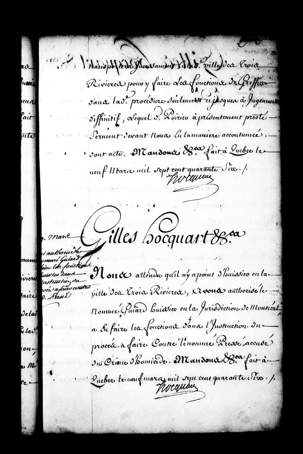 Ordonnance de l'intendant Hocquart qui autorise le nommé Guyard, huissier en la Juridiction de Montréal, à faire les fonctions d'huissier en la Juridiction des Trois-Rivières pour l'instruction du procès à faire contre le nommé Pressé accusé du crime d'homicide, 9 mars 1746, Archives nationales à Québec, Fonds Intendants, (03Q,E1,S1,D34,P3693).