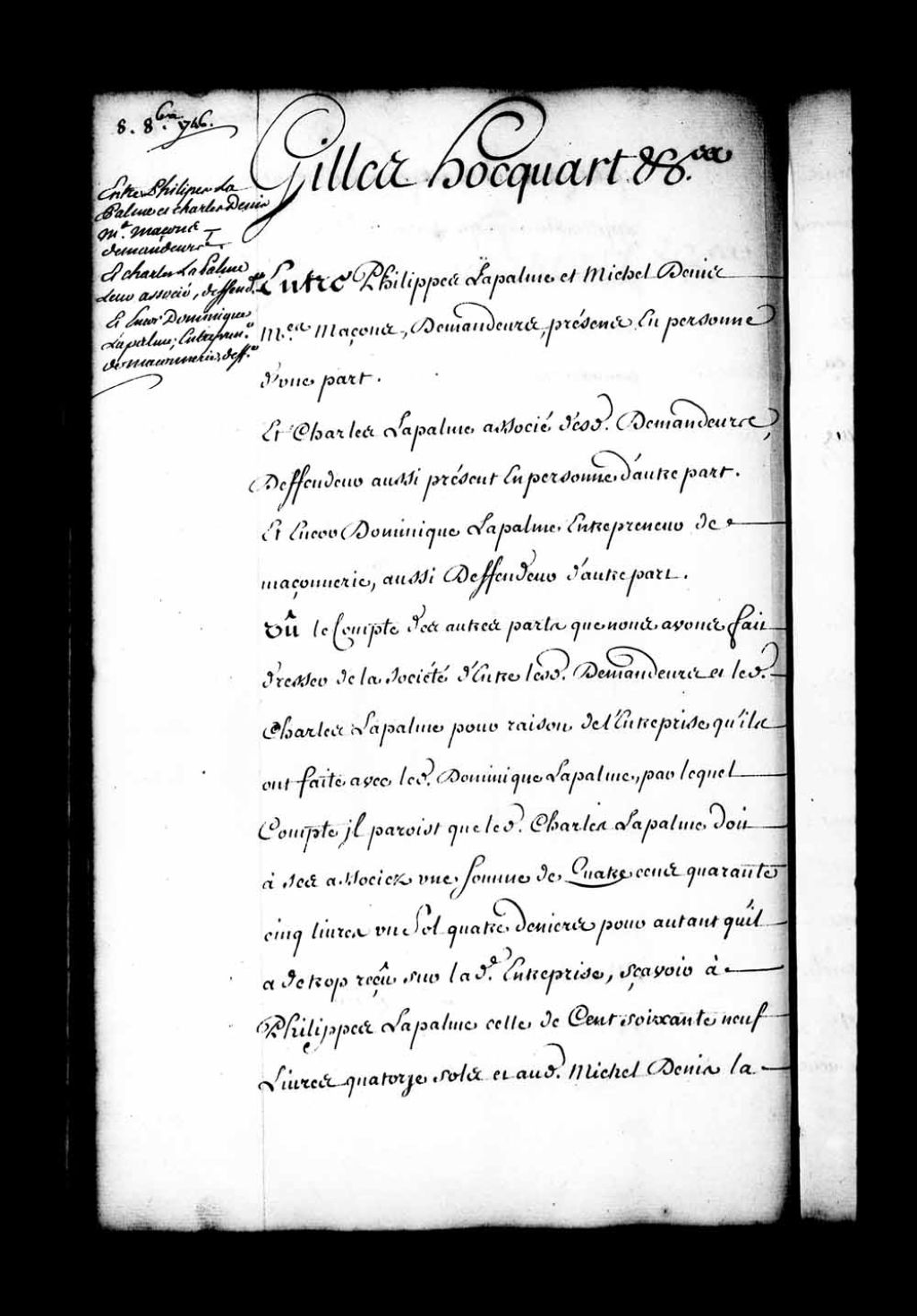 Ordonnance de l'intendant Hocquart qui condamne Dominique Lapalme, entrepreneur de maçonnerie, à payer à Philippe Lapalme, Michel Denis et Charles Lapalme, ses associés, la somme de cent cinquante livres outre et pardessus les deux mille neuf cent cinquante sept livres qu'il leur a ci-devant payées au moyen de quoi il demeurera quitte avec eux; Charles Lapalme condamné à payer et rembourser, savoir à Philippe Lapalme cent soixante neuf livres quatorze sols et à Michel Denis deux cent soixante quinze livres sept sols quatre deniers pour autant qu'il a reçu de trop dans leur entreprise commune, 8 octobre 1746, Archives nationales à Québec, Fonds Intendants, (03Q,E1,S1,D34,P3725).