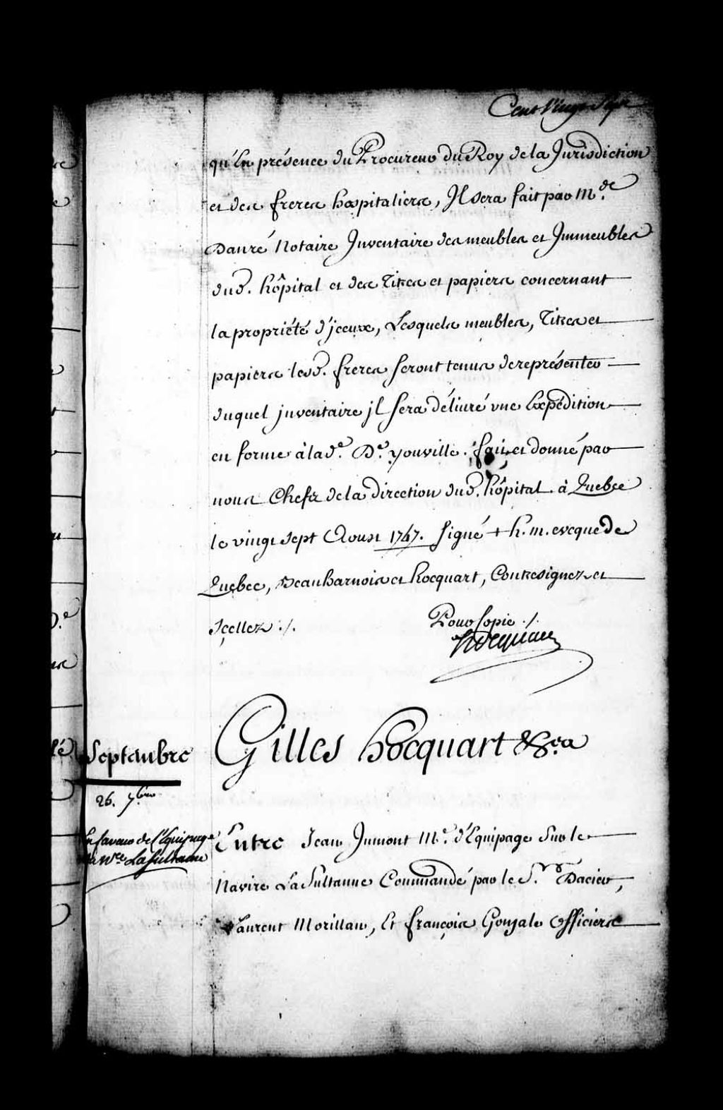 Ordonnance de l'intendant Hocquart qui condamne le sieur Dacier (Dassier), capitaine du navire "la Sultane", à payer aux officiers mariniers et matelots de l'équipage dudit navire chacun d'eux quatre mois de leurs gages pour les mettre en état de s'habiller pour faire le voyage de l'île Saint-Dominique au lieu de retourner en France ainsi qu'il avait été d'abord entendu dans les engagements, 25 septembre 1747, Archives nationales à Québec, Fonds Intendants, (03Q,E1,S1,D34,P3768).