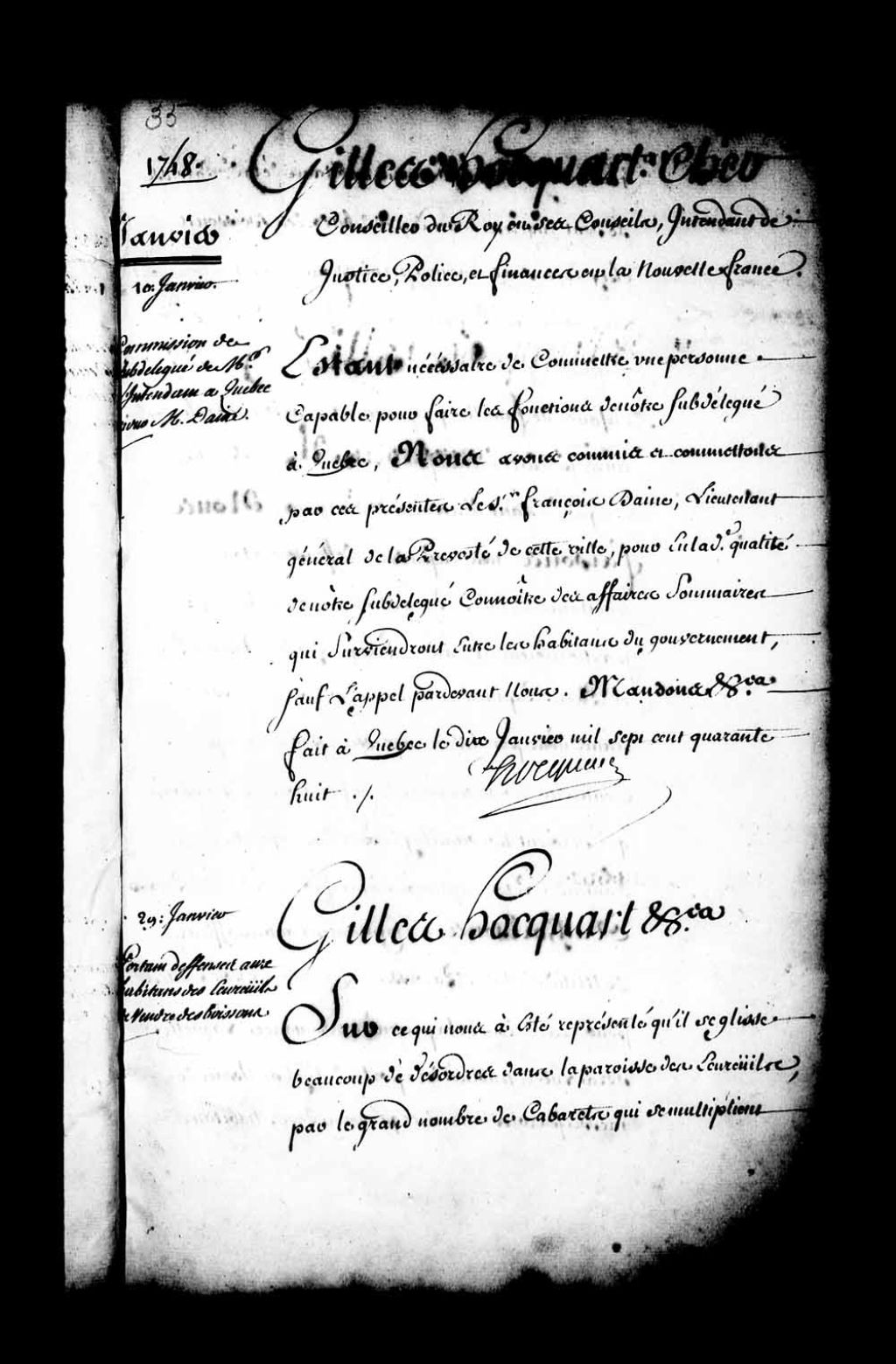 Ordonnance de l'intendant Hocquart qui fait défense à tous habitants de la paroisse des Écureuils et particulièrement à Prisque Godin, Ignace Pleau (Lafleur) et Pierre Papillon, de vendre et débiter des boissons sans une permission écrite de l'intendant, à peine contre les contrevenants de confiscation des boissons qui seraient trouvées chez eux et de cinquante livres d'amende le tout applicable à la fabrique de la paroisse des Écureuils, 29 janvier 1748, Archives nationales à Québec, Fonds Intendants, (03Q,E1,S1,D35,P3783).