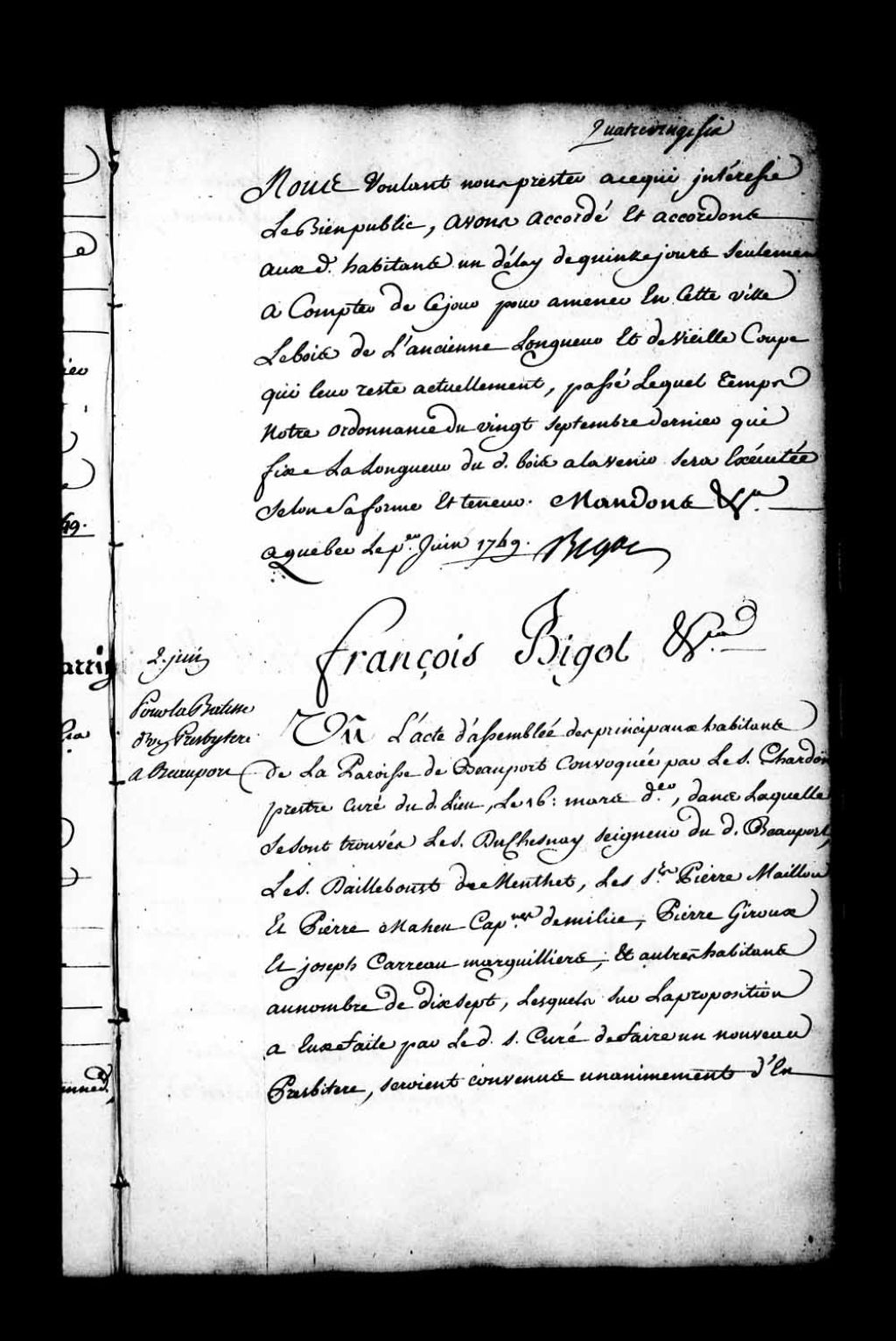 Ordonnance de l'intendant Bigot qui homologue l'acte d'assemblée des habitants de Beauport en date du 23 mars 1749 et, en conséquence, autorise les sieurs Jacques Lefebvre, André Marcoux, Joseph Parant (Parent), Paul Rainville et Noël Giroux, syndics, à faire et dresser conjointement avec le sieur Chardon, curé, et Pierre Mailloux, capitaine de la côte, l'état estimatif de ce qu'il en pourra coûter en argent et matériaux tant pour les réparations qu'il convient de faire cette année pour rendre l'ancien presbytère logeable que pour l'allonge en pierre à y faire, etc