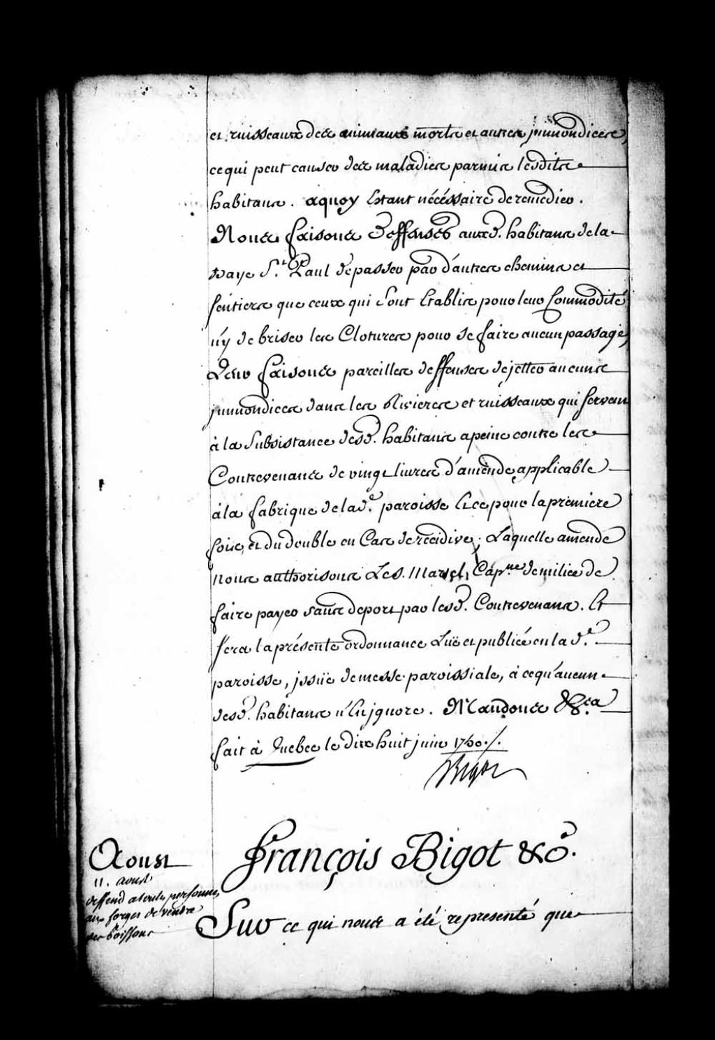 Ordonnance de l'intendant Bigot qui fait nouvelles défenses à toutes personnes à l'exception du sieur Perrault de vendre et débiter directement ni indirectement des boissons et faire aucun commerce de marchandises aux Forges de Saint-Maurice, à peine contre les contrevenants de confiscation des boissons et effets qui seront trouvés chez eux et de cinquante livres d'amende, le tout applicable à l'Hôtel-Dieu des Trois-Rivières