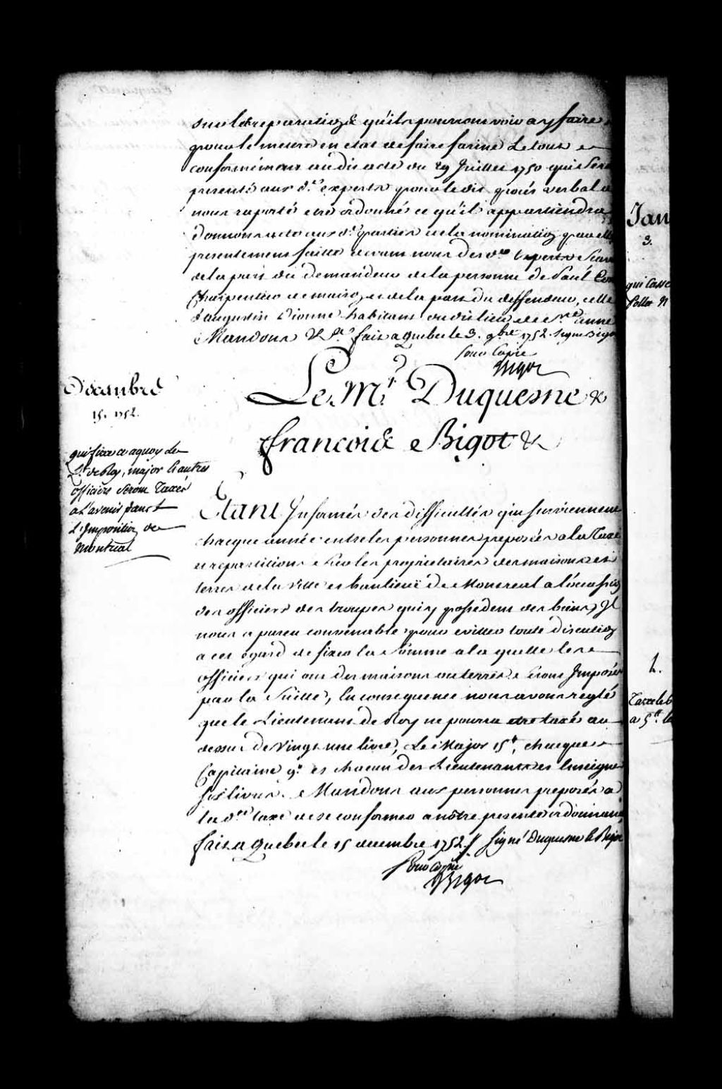 Ordonnance du gouverneur de Duquesne et de l'intendant Bigot qui fixe la contribution des officiers des troupes qui ont des maisons et terres en la ville et banlieue de Montréal pour l'imposition de ladite ville: lieutenant du Roi, pas plus de vingt-une livres; le major, quinze livres; chaque capitaine, neuf livres; chaque lieutenant et enseigne, six livres, 15 décembre 1752, Archives nationales à Québec, Fonds Intendants, (03Q,E1,S1,D40,P4112).