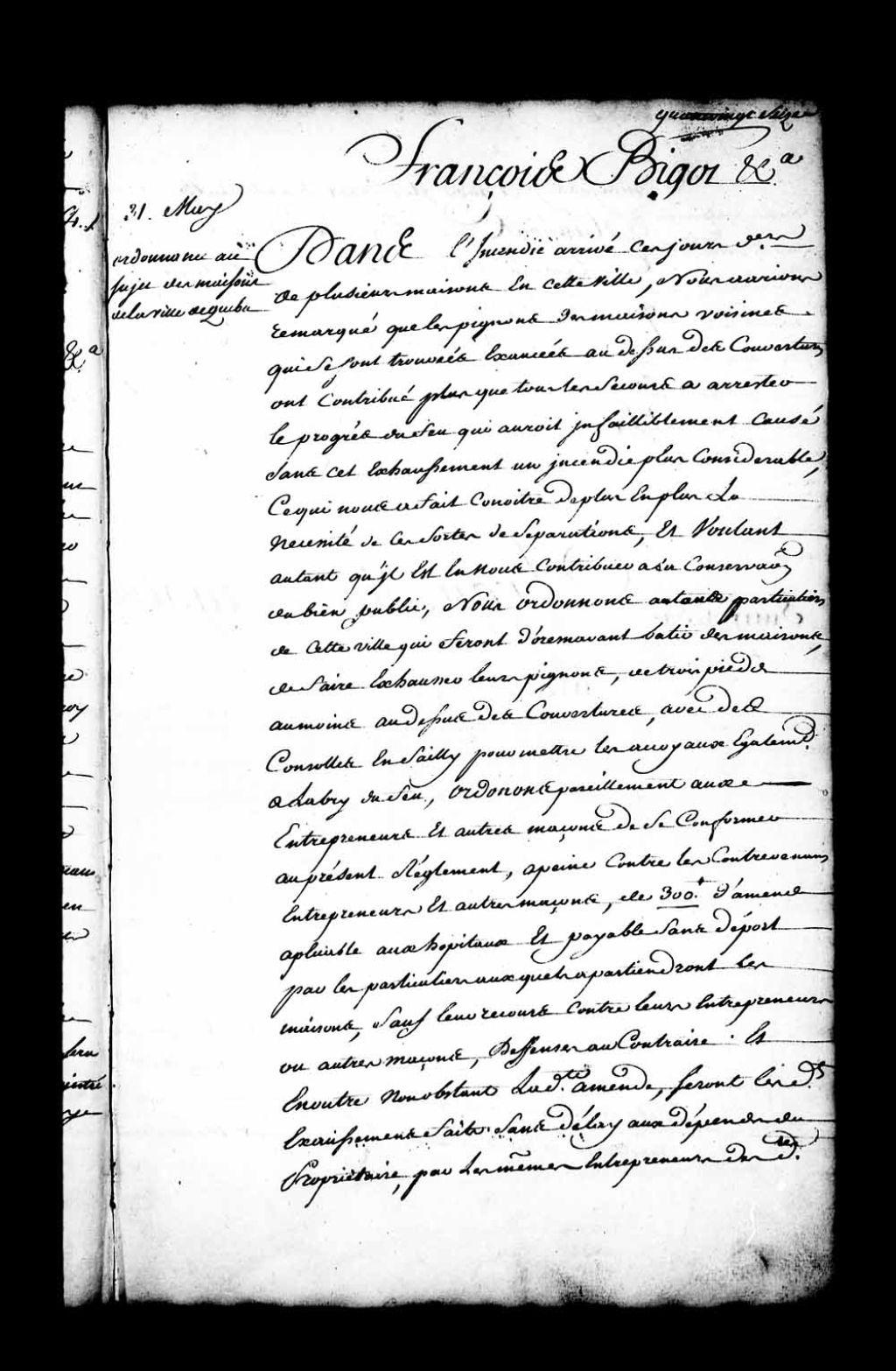 Ordonnance de l'intendant Bigot qui, pour protéger la ville de Québec contre les incendies, porte qu'à l'avenir tous les particuliers qui feront bâtir des maisons devront exhausser leurs pignons de trois pieds au moins au dessus des couvertures, avec des consoles en saillie pour mettre les anoyaux également à l'abri du feu; enjoint aux entrepreneurs et maçons de se conformer au présent règlement à peine contre les contrevenants de trois cents livres d'amende applicables aux hôpitaux et payables sans déport par les particuliers auxquels appartiendront les maisons, sauf leur recours contre leurs entrepreneurs, etc, 31 mai 1754, Archives nationales à Québec, Fonds Intendants, (03Q,E1,S1,D40,P4169).