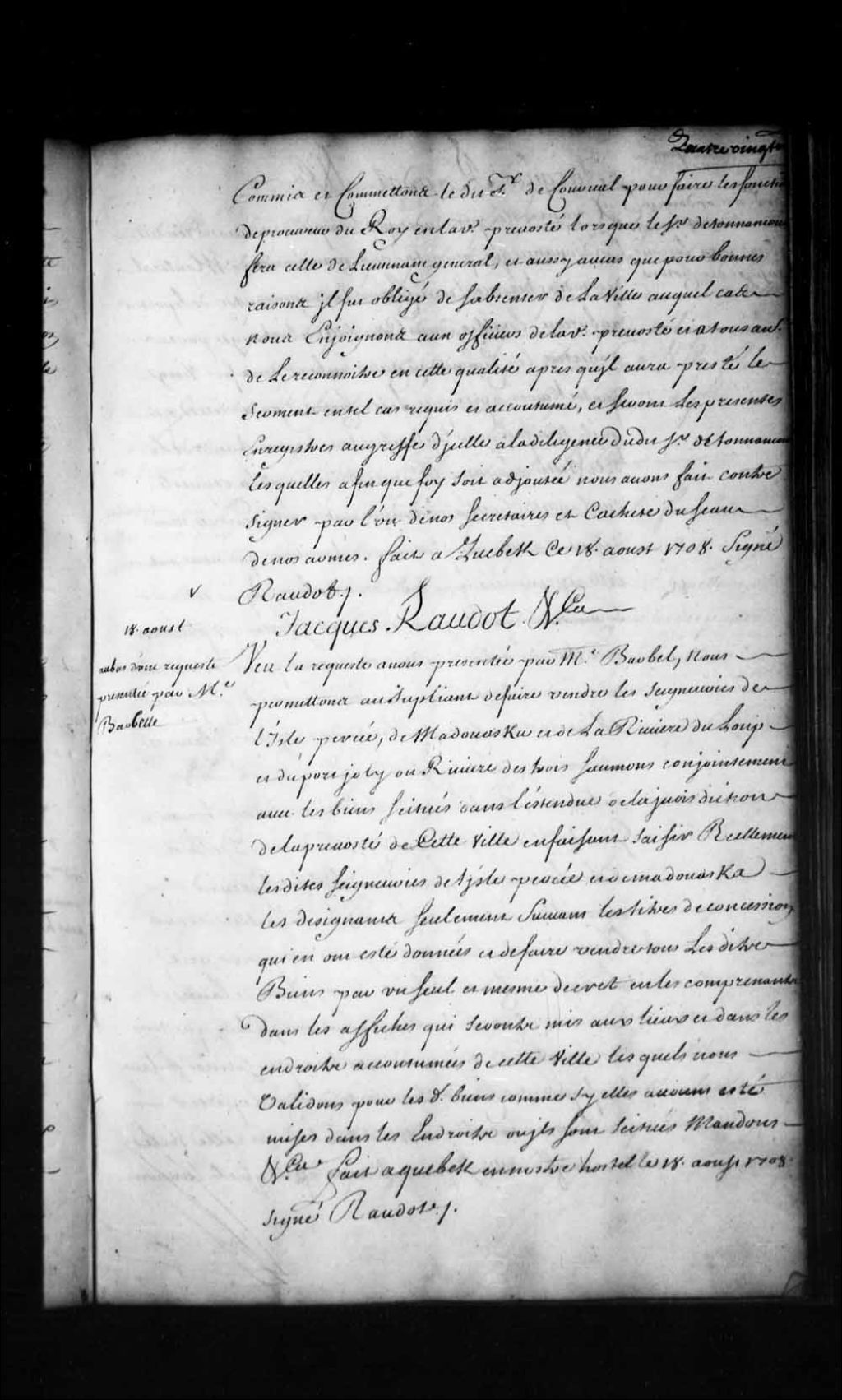 Ordonnance de l'intendant Jacques Raudot qui permet au sieur Barbel de faire vendre les seigneuries de l'île Percée, de Madaouaska (Madawaska), de la Rivière-du-Loup et du Port-Joly (Port-Joli) ou Rivière-des-Trois-Saumons conjointement avec les biens situés dans l'étendue de la Juridiction de la Prévôté de Québec