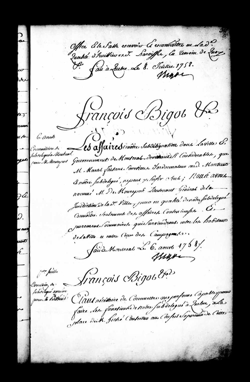 Commission de subdélégué de l'intendant à Québec par l'intendant Bigot pour Joseph Perthuis, conseiller au Conseil supérieur, à la place de Henri Hiché, conseiller au Conseil supérieur, 1er juillet 1758, Archives nationales à Québec, Fonds Intendants, (03Q,E1,S1,D42,P4280).