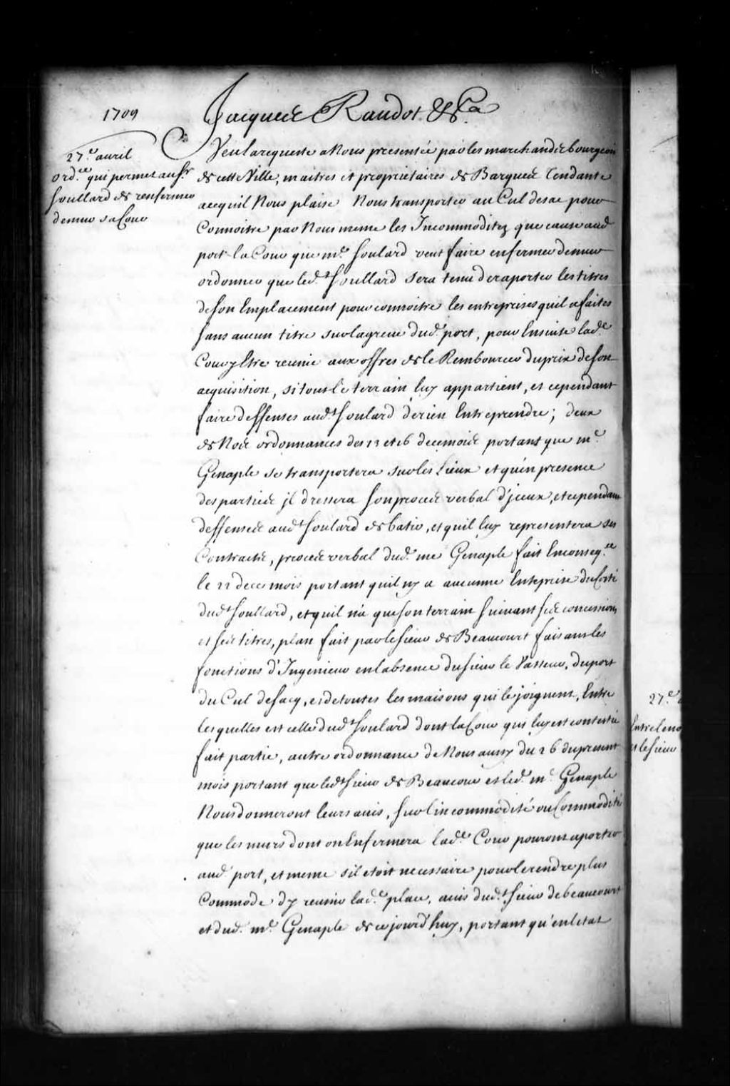 Ordonnance de l'intendant Jacques Raudot qui permet au sieur Soulard (Soullard) de bâtir un mur sur sa propriété dans le Cul-de-sac dans la Basse-Ville de Québec, 25 avril 1709, Archives nationales à Québec, Fonds Intendants, (03Q,E1,S1,D3,P515).