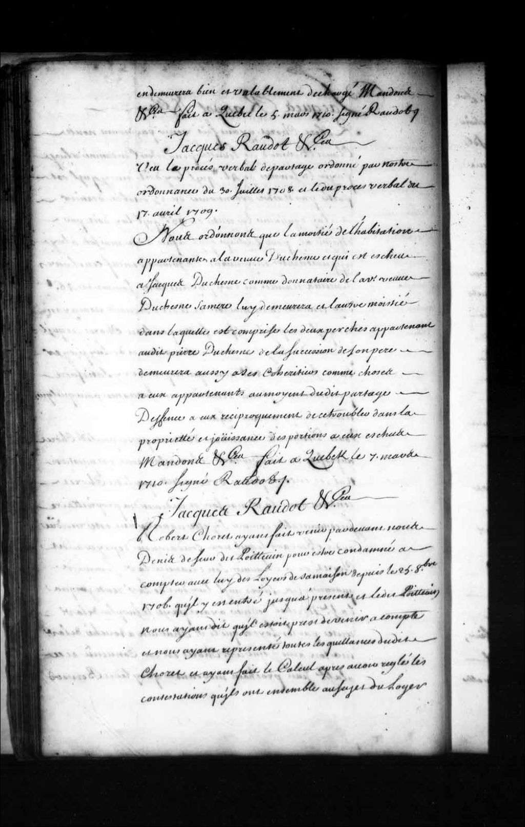 Ordonnance de l'intendant Jacques Raudot au sujet du partage d'une habitation entre la veuve Duchêne (Duchesne) et Jacques Duchêne, son fils, 7 mars 1710, Archives nationales à Québec, Fonds Intendants, (03Q,E1,S1,D4,P636).