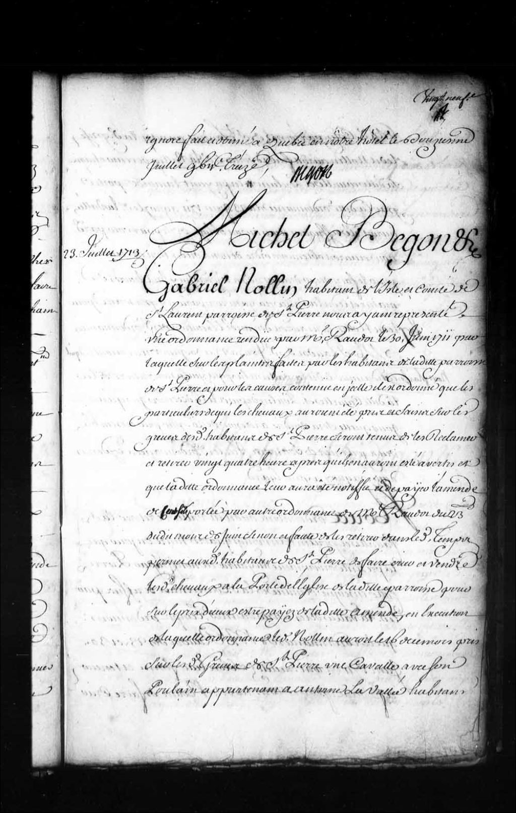 Ordonnance de l'intendant Bégon contre Antoine Lavallée, habitant de Saint-Laurent, qui, au mépris des ordonnances, a laissé errer sur les grèves de Saint-François une cavalle (cheval, jument) et son poulain, 23 juillet 1713, Archives nationales à Québec, Fonds Intendants, (03Q,E1,S1,D6,P860).