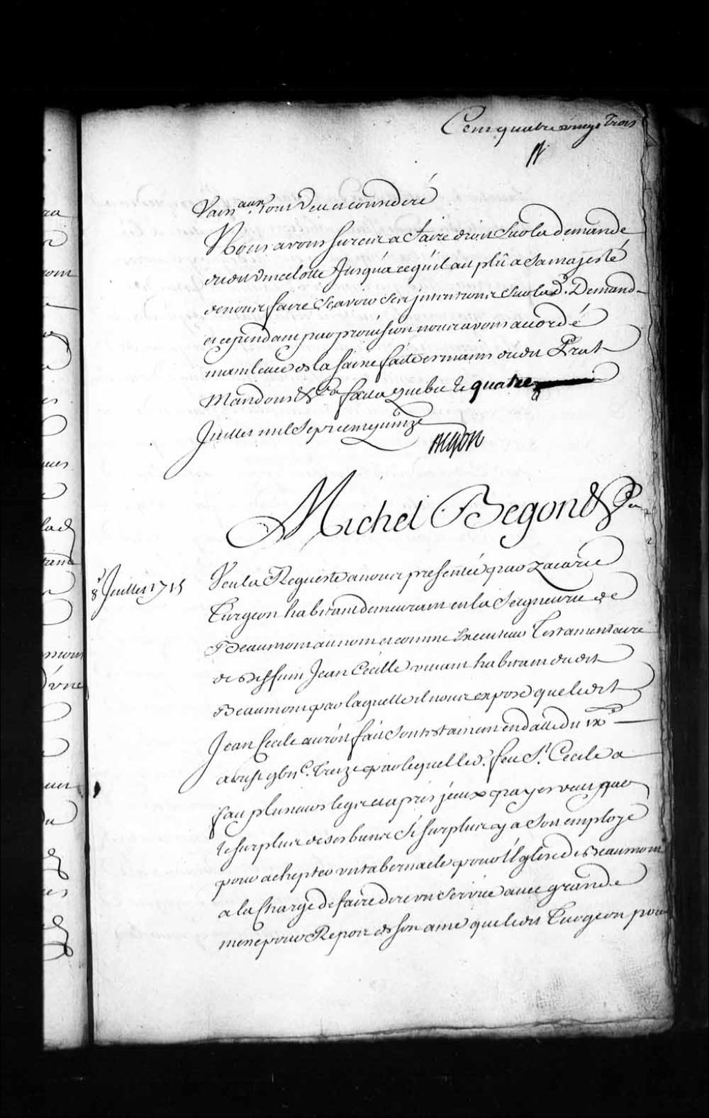 Ordonnance de l'intendant Bégon qui décide que la terre de feu Jean Cécille (Cécire, Saint-Cyr), habitant de Beaumont, sera vendue à la porte de l'église de Beaumont au plus offrant et dernier enchérisseur pour, une fois les legs et dettes dudit Cécille payés, le surplus employé, au désir du testament dudit Cécille, à acheter un tabernacle pour l'église de Beaumont