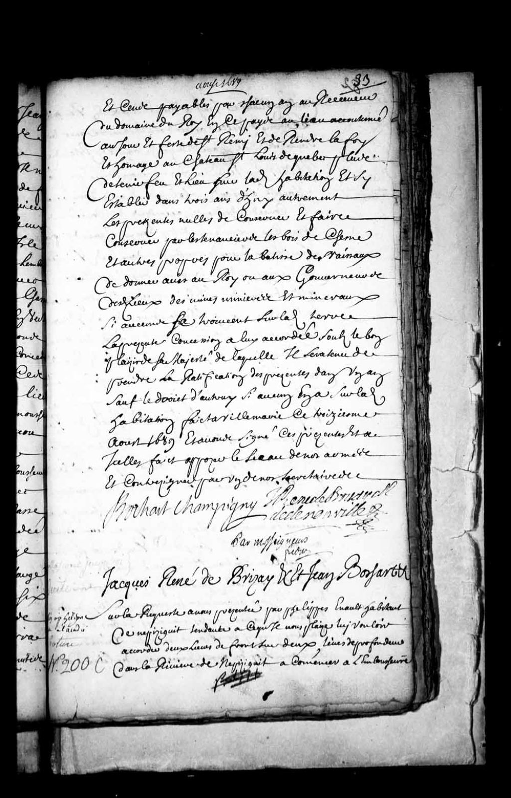 Acte de concession par Jacques-René de Brisay, Marquis de Denonville, et Jean Bochart Champigny, gouverneur et intendant de la Nouvelle-France, au sieur Philippe Esnauth (Énaud, Esnault, Énault) de deux lieues de terre de front et de deux lieues de profondeur donnant sur la rivière Nipisiguit (Népiziquit) à l'Acadie, à commencer dans l'embouchure de ladite rivière jusqu'à deux lieues en la remontant, laquelle concession comprenant en outre le droit de traite avec les Sauvages (Amérindiens) et le droit de chasse et de pêche dans ladite étendue