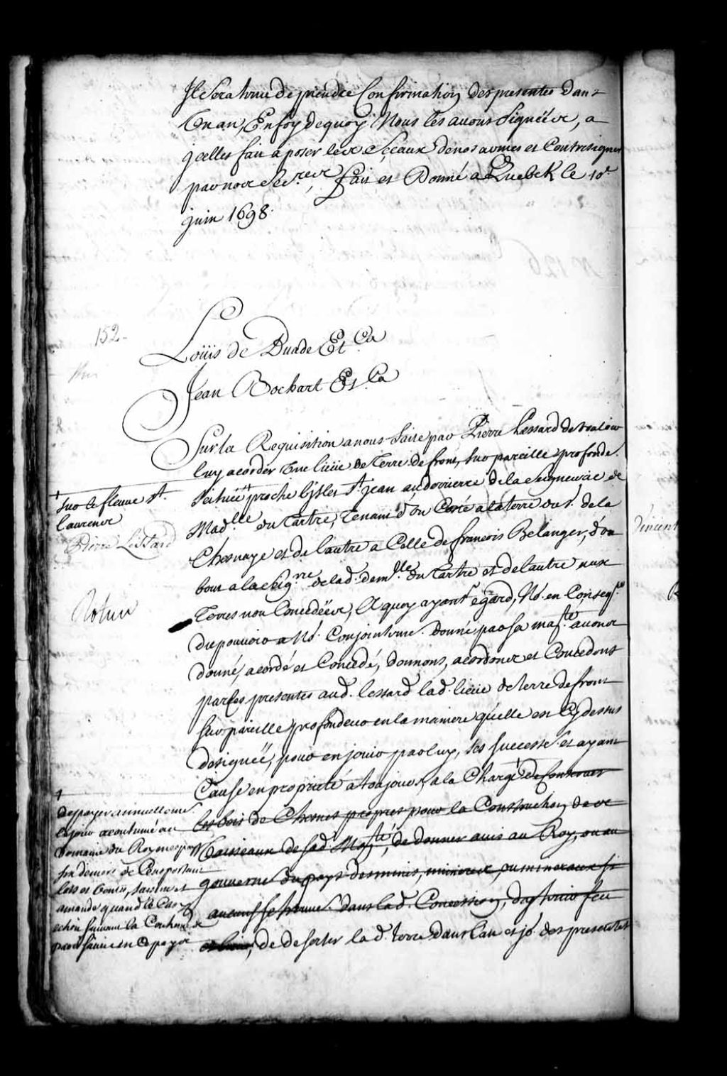 Acte de concession par Louis de Buade, Comte de Frontenac, et Jean Bochart Champigny, gouverneur et intendant de la Nouvelle-France, à Pierre Lessard d'une lieue de terre de front sur pareille profondeur près de l'îlet Saint-Jean, au derrière de la seigneurie de damoiselle du Tartre, lequel emplacement tenant d'un côté à la terre du sieur de la Chesnaye (LaChesnaye, Lachenaie) et de l'autre à celle de François Bélanger, d'un bout à la seigneurie de damoiselle du Tartre et de l'autre aux terres non concédées, 30 juin 1698, Archives nationales à Québec, Fonds Intendants, (03Q,E1,S3,P211).