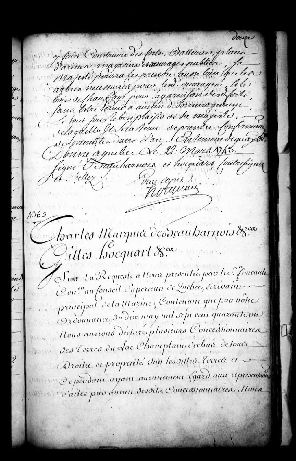 Acte de concession par Charles de Boische, Marquis de Beauharnois, et Gilles Hocquart, gouverneur et intendant de la Nouvelle-France, au sieur Foucault, conseiller au Conseil supérieur de Québec et écrivain principal de la Marine, de l'étendue de terrain de deux lieues de front sur la rivière Chambly (Richelieu), sur la profondeur qui se trouvera jusqu'à la baie de Missisquoi, laquelle étendue lui avait déjà été accordée le 3 avril 1733 et avait été réunie au Domaine de Sa Majesté le 10 mai 1741, avec en outre une lieue de front d'augmentation sur la même profondeur, à prendre au bout desdites deux lieues en remontant ladite rivière Chambly en tirant au sud, et dans la profondeur par deux lignes parallèles courant est et ouest jusqu'à ladite baie de Missisquoi, lesdites deux lignes joignant au terrain réuni et non concédé, à titre de fief et seigneurie avec haute, moyenne et basse justice