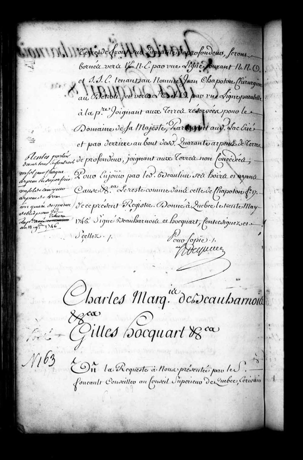 Acte de concession par Charles de Boische, Marquis de Beauharnois, et Gilles Hocquart, gouverneur et intendant de la Nouvelle-France, au sieur Foucault, conseiller au Conseil supérieur de Québec et écrivain principal de la Marine, d'une augmentation d'une langue de terre ou presqu'île d'environ deux lieues de front, joignant la concession lui ayant été faite le 1er mai 1743, en remontant la rivière Chambly (Richelieu) jusqu'à la pointe appelée pointe du Détour, laquelle étendue de terrain avait été concédée au sieur de L'Isle (Delisle) et abandonnée aussitôt, lequel terrain ne fera avec ladite concession du 1er mai 1743 qu'une seule et même seigneurie, à titre de haute, moyenne et basse justice