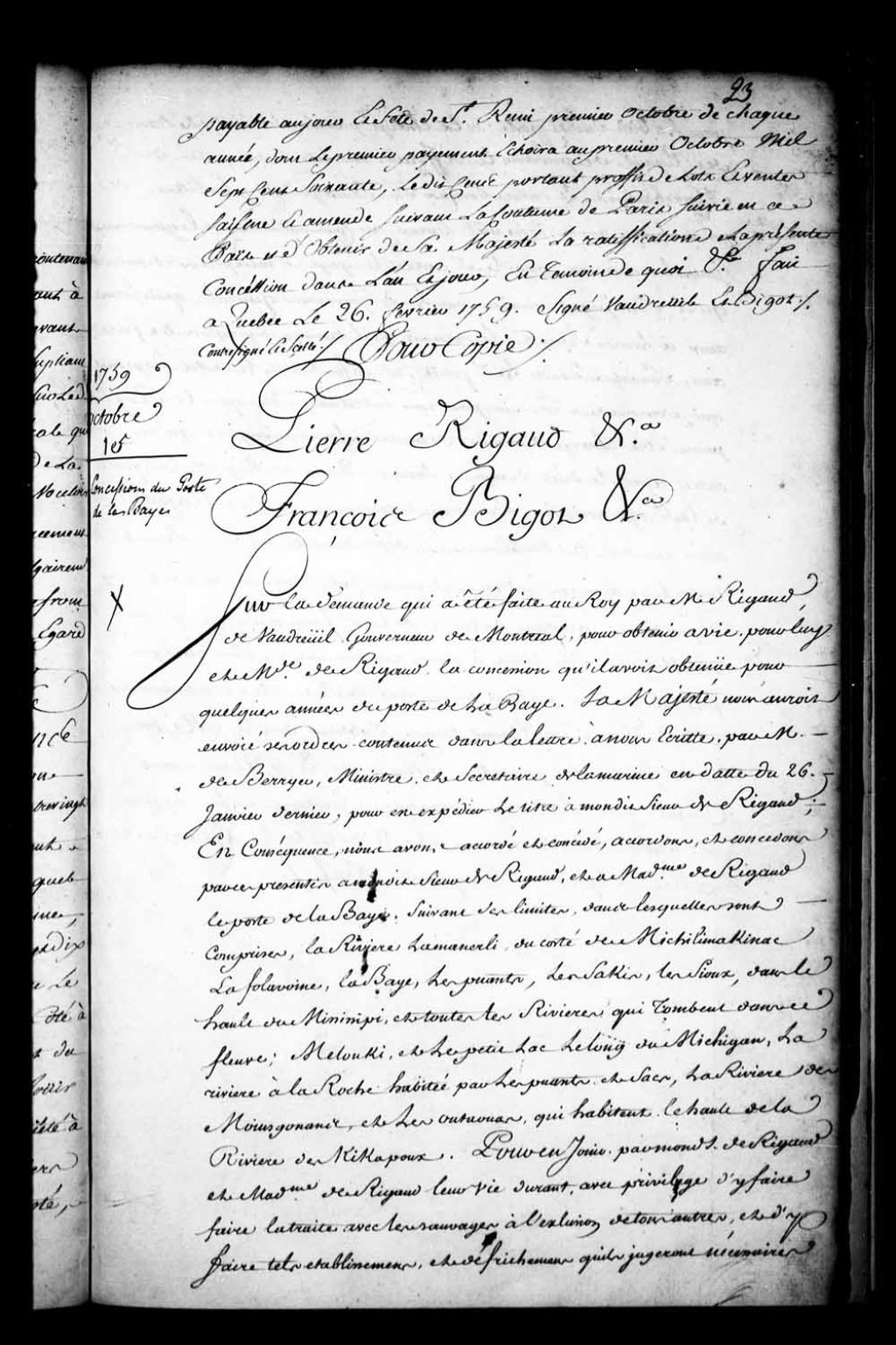 Acte de concession par Pierre de Rigaud, Marquis de Vaudreuil-Cavagnial, et François Bigot, gouverneur et intendant de la Nouvelle-France, au sieur Rigaud de Vaudreuil, gouverneur de Montréal, du poste de la Baie, suivant les limites dans lesquelles sont comprises la rivière Lamornerli, du côté des Michilimakinac, Lafolavoine, la Baye, les Puants, les Sakis, les Sioux, dans la houle du Mississippi, et toutes les rivières qui tombent dans ce fleuve, Melouki et le petit lac le long du Michigan, la rivière à la Roche habitée par les Puants et la rivière des Moinsgonants et les Outaouais, qui habitent le haut de la rivière des Kikapoux, pour en jouir toute sa vie, y faire la traite avec les Sauvages (Amérindiens) et y faire des établissements et du défrichement