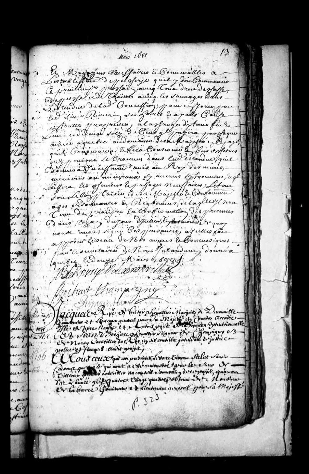 Acte de concession par Jacques-René de Brisay, Marquis de Denonville, et Jean Bochart Champigny, gouverneur et intendant de la Nouvelle-France, au sieur Augustin Rouer de la Cardonnière (LaCardonnière) de l'étendue de deux lieues de terre de front, bois et prés sur le fleuve Saint-Laurent, depuis la concession du Bic, appartenant au sieur de Vitré, en descendant ledit fleuve, avec deux lieues de profondeur dans les terres, ladite concession comprenant en outre la rivière dite de Rimouski et les autres rivières et ruisseaux, si personne ne se trouve dans ladite étendue, avec l'île de Saint-Barnabé et les battures, îles et îlets entre lesdites terres et ladite île, à titre de fief, seigneurie et justice