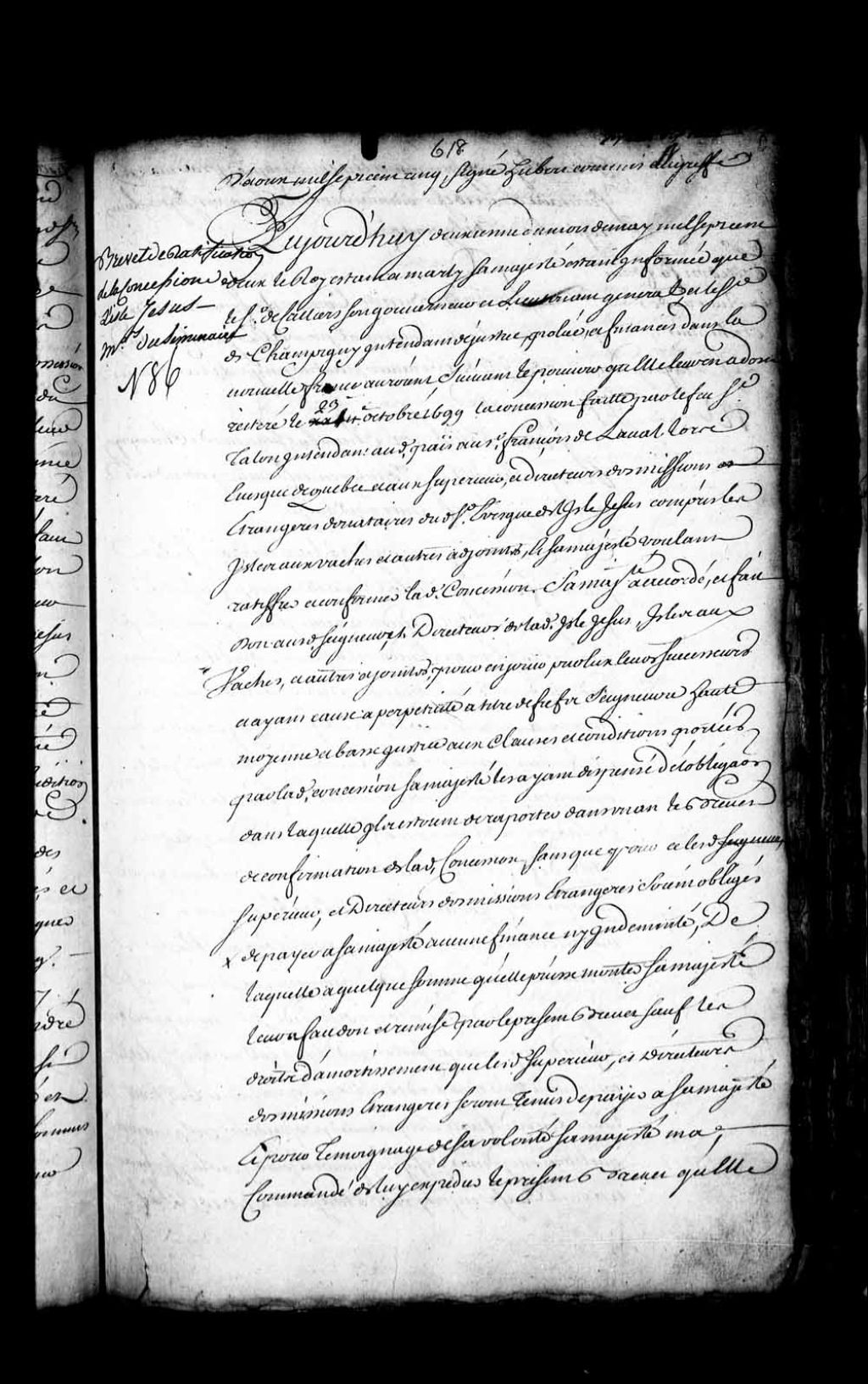 Brevet de confirmation par Sa Majesté de la concession accordée aux supérieur et directeurs des Missions Étrangères, donataires de monseigneur de Laval, de l'île Jésus, des îles aux Vaches et des autres adjacentes, laquelle concession ayant été faite le 23 octobre 1699 par messires de Callières et Bochart Champigny, gouverneur et intendant de la Nouvelle-France