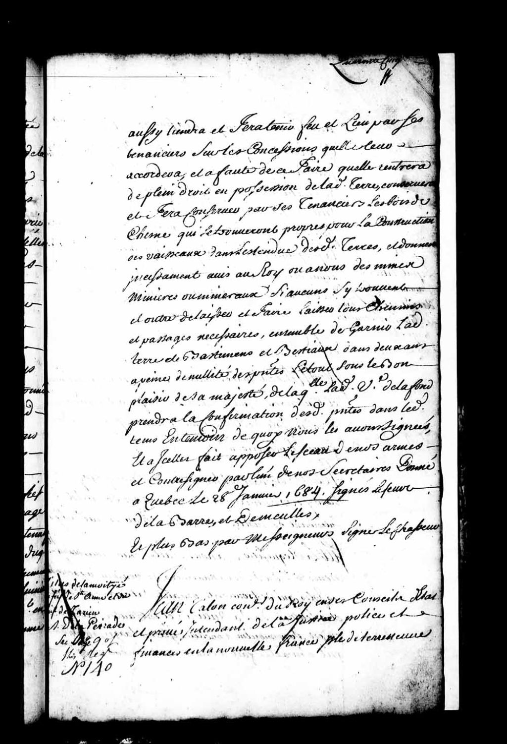 Acte de concession par Louis de Buade, Comte de Frontenac, et Jean Bochart Champigny, gouverneur et intendant de la Nouvelle-France, à Marguerite Denys (Denis), veuve du sieur de Lanaudière, des îles se trouvant devant sa terre de Sainte-Anne et à l'entrée de sa rivière, avec entre autres celle où est son moulin, appelée l'île du Large, attendu qu'il n'en a été fait aucune mention dans l'acquisition faite du sieur Amelin (Hamelin) en l'année 1670 ni dans le titre émis par le sieur Talon, alors intendant en ce pays, autorisant ladite vente en 1672, ladite concession étant faite aux mêmes droits et charges portés au titre de concession de sa terre de Sainte-Anne et à condition de prendre ratification des présentes de Sa Majesté d'ici un an
