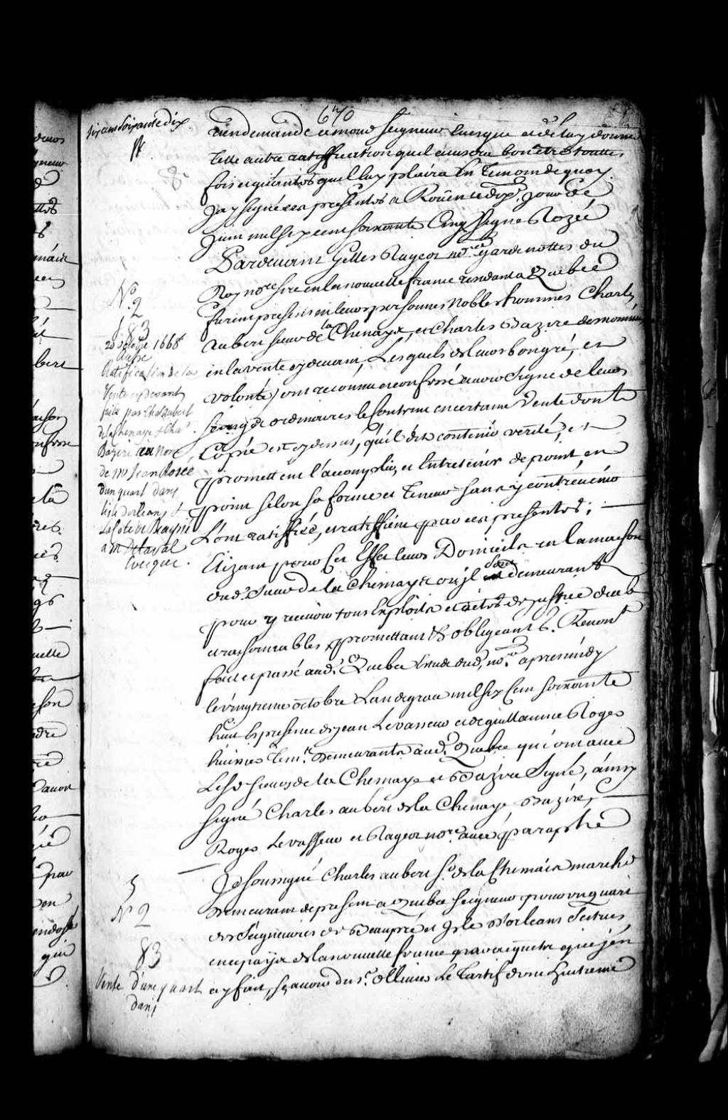 Contrat de vente sous seing privé par Charles Aubert de la Chesnaye (LaChesnaye, Lachenaie) à messire François de Laval d'un quart dans la seigneurie de Beaupré, lequel quart lui appartenant par les acquis qu'il en a fait, à savoir du sieur Olivier Le Tardif (LeTardif) une huitième partie par contrat passé le 13 avril 1662 devant le notaire Claude Aubert du 13 avril 1662, et des Révérendes Mères de l'Hôtel-Dieu de Québec une autre huitième partie par contrat passé le 9 février 1776 devant le notaire Michel Fillion