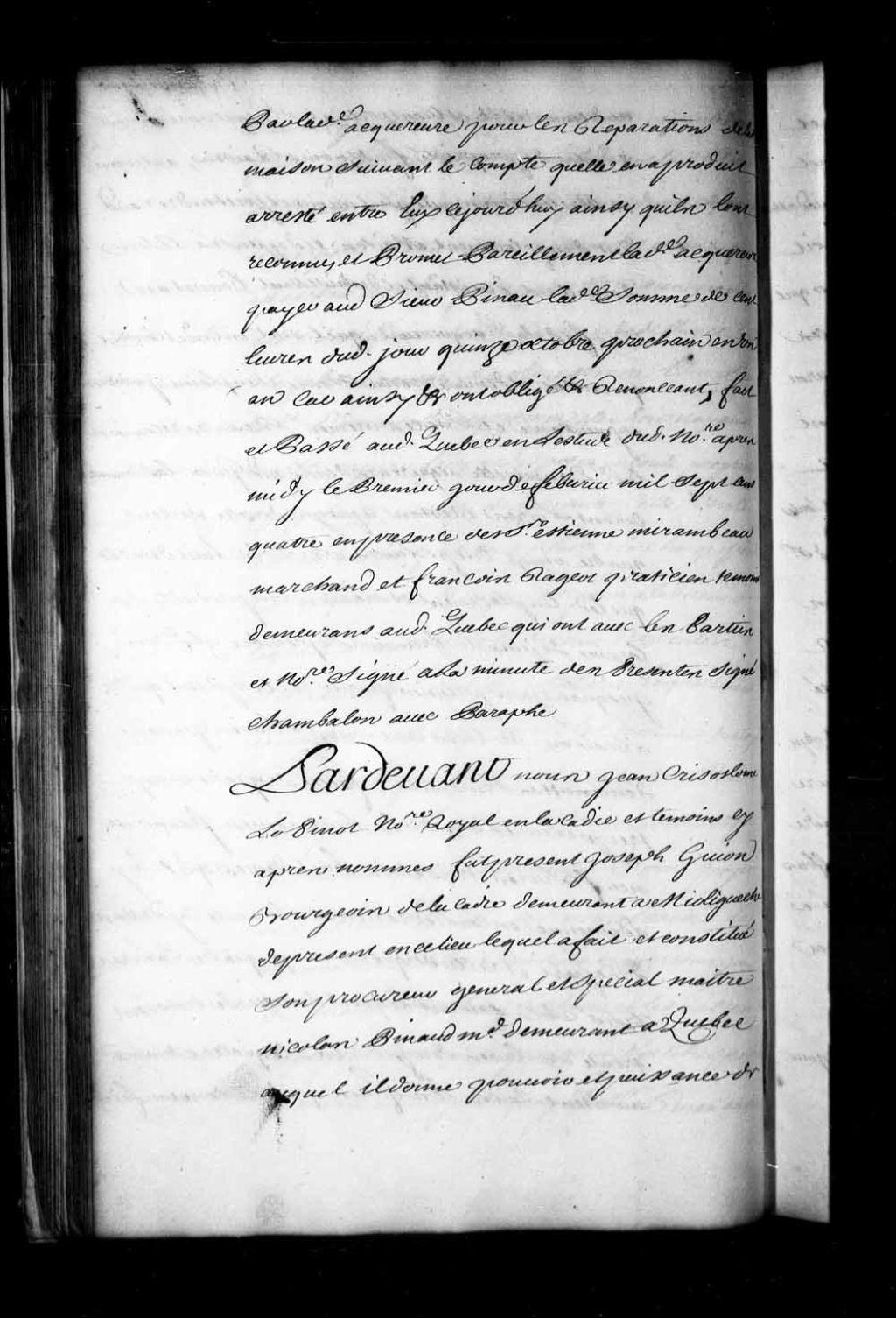 Procuration de Joseph Guion (Guyon), bourgeois de l'Acadie, envers Maître Nicolas Pinaud (Pinault, Pineau, Pinot), marchand de Québec, lui donnant pouvoir de vendre en son nom le quart d'une maison sise rue Saint-Pierre en la Basse-Ville de Québec (Notaire Jean-Chrysostome LePinot, Acadie)