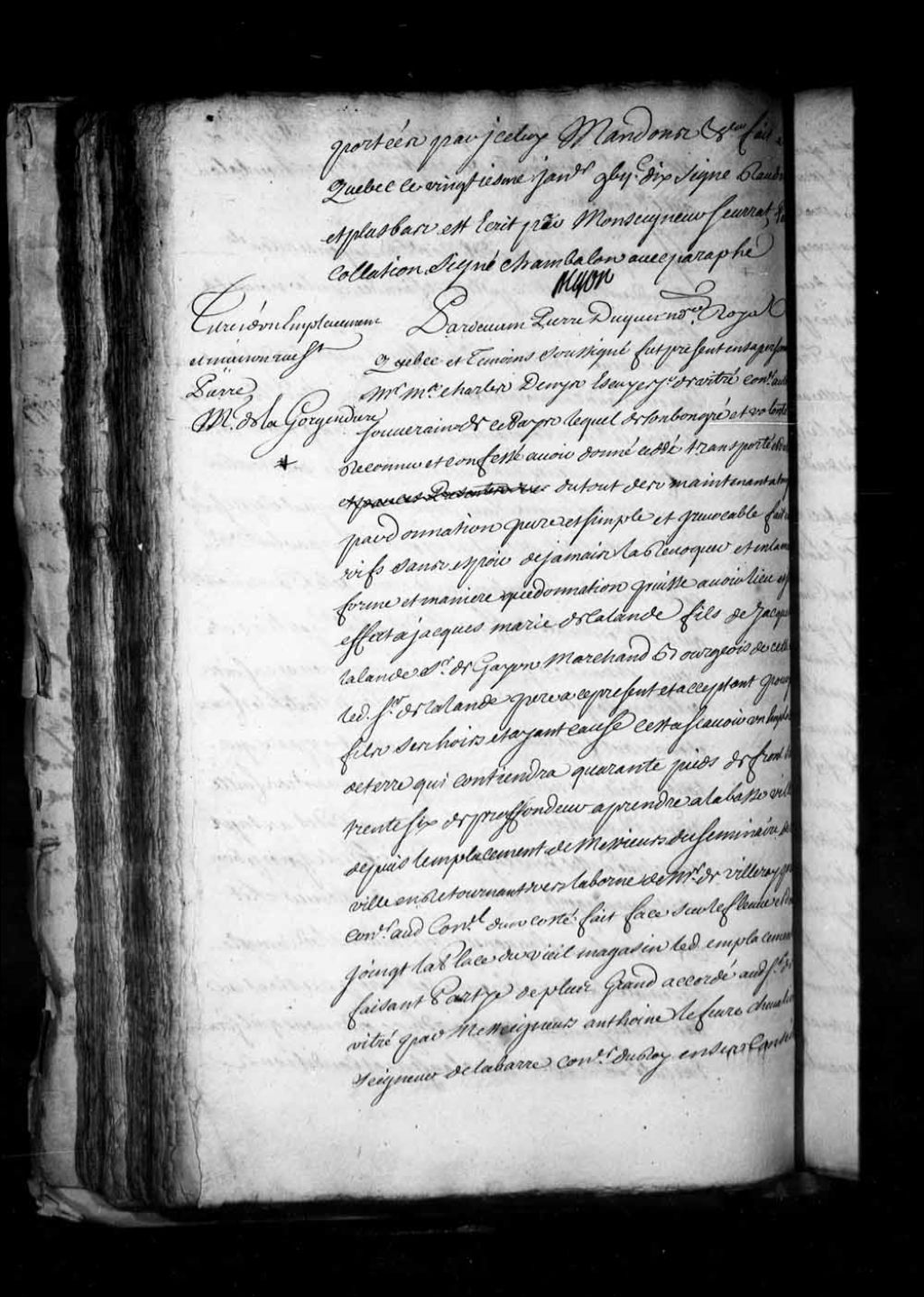 Donation entre vifs par le sieur Charles Denys (Denis), écuyer, sieur de Vitré et conseiller au Conseil souverain de la Nouvelle-France, à Jacques-Marie de Lalande, fils de Jacques Lalande, sieur de Gayon, marchand bourgeois de Québec, d'un emplacement sis en la Basse-Ville de Québec et borné par la place du vieux magasin (rue Saint-Pierre) (Notaire Pierre Duquet de Lachesnaye)