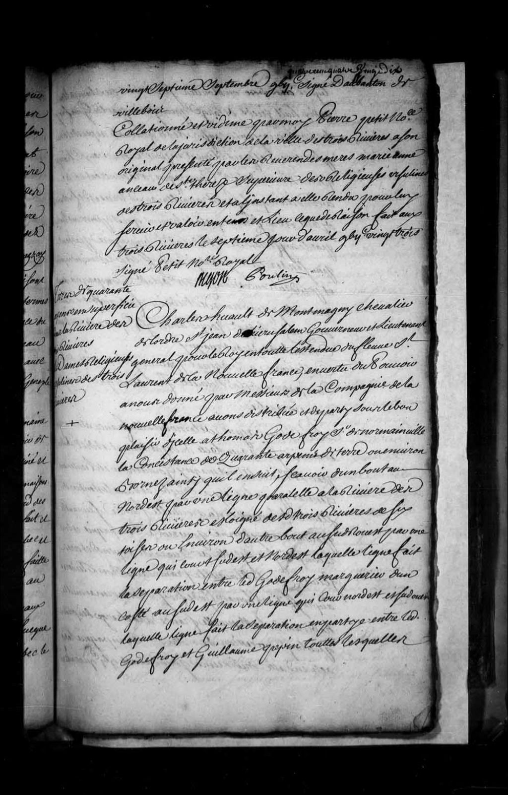 Concession par Charles Huault de Montmagny, Chevalier de l'Ordre de Saint-Jean de Jérusalem, gouverneur et lieutenant général pour le Roi en Nouvelle-France, à Thomas Godefroy, sieur de Normainville (Normanville), d'un emplacement sis parallèlement à la rivière des Trois-Rivières