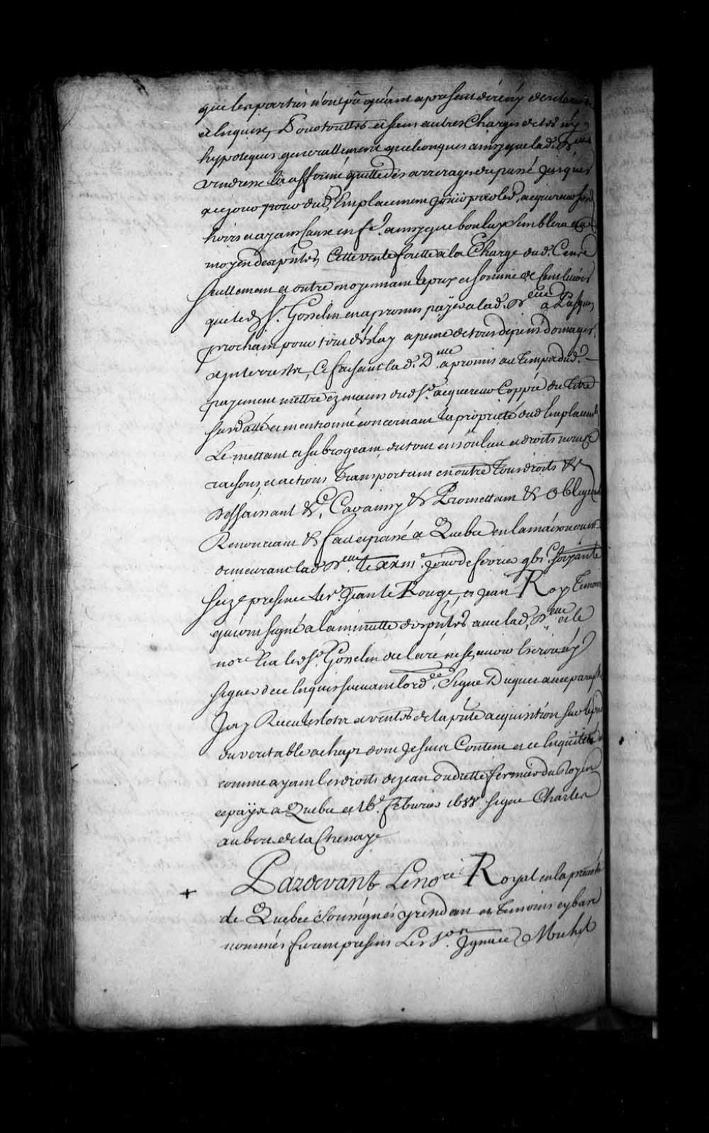 Contrat de vente par les frères Ignace Gosselin, Michel Gosselin, François Gosselin, Gabriel Gosselin et Jean Gosselin, demeurant tous à l'île Saint-Laurent (île d'Orléans), tant en leur nom que pour François Gosselin, leur frère absent, au sieur Pierre Haimard (Haymard, Aymard, Émard), marchand bourgeois de Québec, et damoiselle Louise Guillot, sa femme, d'un emplacement et d'une maison sis rue Sous-le-fort en la Basse-Ville de Québec (Notaire Louis Chambalon), 16 mars 1699, Archives nationales à Québec, Fonds Intendants, (03Q,E1,S4,SS1,D294,P3).