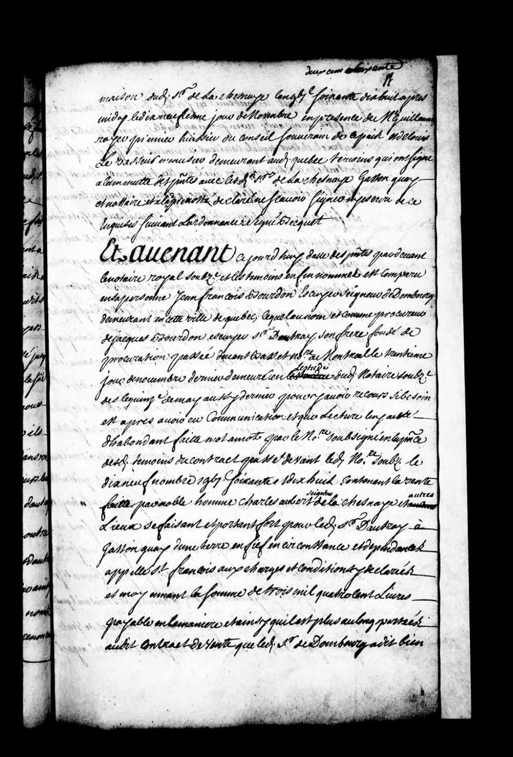 Ratification par Jean-François Bourdon, sieur de Dombourg, procureur de son frère Jacques Bourdon, sieur Dautré (Dautray, d'Autray), du contrat de vente consenti par Charles Aubert de la Chesnaye (Lachesnaye) à Gaston Guay et sa femme, lequel acte de vente ayant été passé le 19 novembre 1678 devant le notaire Romain Becquet (Notaire Romain Becquet), 20 novembre 1678, Archives nationales à Québec, Fonds Intendants, (03Q,E1,S4,SS1,D77,P12).