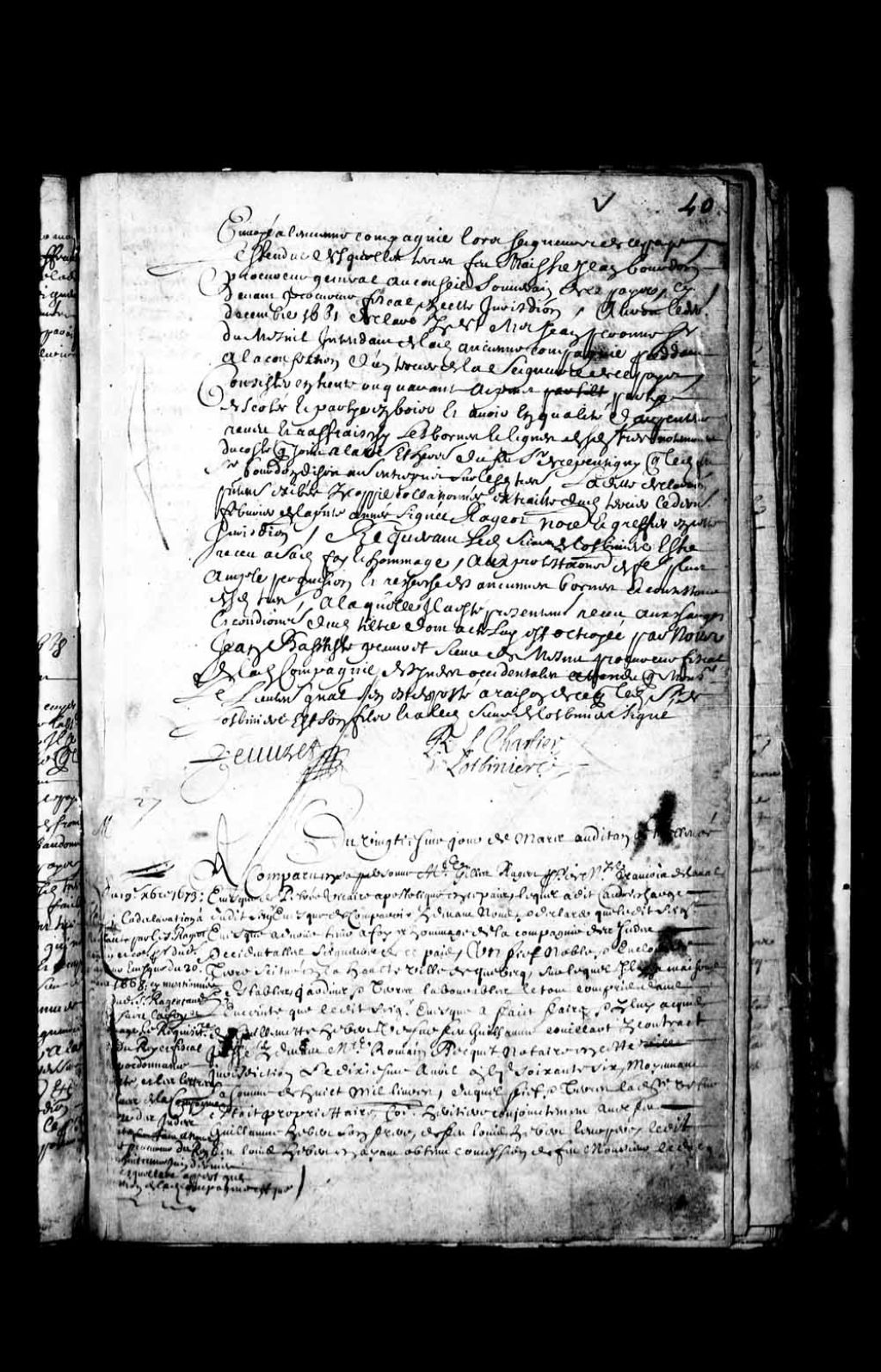 - Transcription du texte avec orthographe modernisée : «Du vingtième jour de mars au dit an, de relevée. A comparu en sa personne maître Gilles Rageot, procureur de Messire François de Laval, évêque de Pétrée, vicaire apostolique en ce pays, lequel a dit avoir charge du dit seigneur évêque de comparaître (comparoir) par-devant nous et déclare que le dit seigneur évêque avoue tenir à foi et hommage de la Compagnie des Indes Occidentales, seigneurs de ce pays, un fief noble et enclos de terre situé en la haute ville de Québec sur lequel il y a maisons, étables, jardins et terres labourables, le tout compris dans l'enceinte que le dit seigneur évêque a fait faire et par lui acquis de Guillemette Hébert, veuve feu Guillaume Couillard par contrat passé par-devant Maître Romain Becquet, notaire en cette juridiction, le dixième avril mille six cent soixante-six, moyennant la somme de huit mille livres, duquel fief et terre la dite veuve était propriétaire comme héritière conjointement avec feu Guillaume Hébert, son frère, de feu Louis Hébert, leur père, le dit feu Louis Hébert en ayant obtenu concession de feu Monsieur le Duc de Monmorency, ci-devant vice-Roy de ce pays, et ratification d'icelle par feu Monseigneur le Duc de Vantadour, aussi ci-devant vice-Roy de ce pays, par titre en date du dernier février mille six cent vingt-six à nous exhibé en copie collationnée par le dit Rageot, greffier notaire en cette juridiction, avec le procureur fiscal en icelle, le quinzième décembre dernier signé Peuvret et Rageot la dite collation faite suivant copie collationnée à la requête du dit feu Couillard signée M. Piraube et datée du sixième septembre mille six cent quarante, la dite collation faite suivant copie en parchemin collationnée à l'original aussi en parchemin par les notaires, garde-notes au Châtelet de Paris le vingtième février mille six cent trente-trois par laquelle dite copie appert la dite quantité de terre avoir été érigée en fief noble relevant du fort et château de cette ville de Québec aux charges et conditions que le dit feu Sieur Vantadour (Ventadour) jugerait à propos d'y imposer, le dit fief et terre joignant d'un côté aux terres de l'église, d'autre côté le long du fleuve Saint-Laurent et de la rivière Saint-Charles, d'un bout Octave Zapagia écuyer, Sieur de ressan, à cause de son acquêt et d'autre bout l'enclos des religieuses hospitalières et aux autres terres appartenantes à la dite veuve Couillard, le petit ruisseau qui descend dans l'enclos des dites religieuses entre deux de laquelle dite déclaration et exhibition de la dite copie collationnée et contrat d'acquêt le dit Sieur Rageot a requis acte et de ce qu'il a offert faire les foi et hommage par-devant nous pour l'absence de nos dits seigneurs tel que le dit seigneur évêque les leur doit. Rageot François, évêque de Pétrée Sur quoi, Ouï le procureur fiscal qui a dit que comme il n'appert de titre en forme valable et qu'il n'y a même aucune expression des noms des notaires ni de leur signature que l'on prétend avoir signé par collation la dite copie en parchemin datée du vingtième février mille six cent trente-trois il ne peut consentir à la réception de la dite foi et hommage et qu'il n'empêche qu'acte ne soit accordé au dit seigneur évêque de la dite déclaration sans tirer à conséquence ni préjudicier au payement des droits dus à nos seigneurs à cause du dit acquêt nous avons accordé le dit acte au désir des conclusions du dit Sieur procureur fiscal pour servir ce qu'il appartiendra, sauf à recevoir la dite foi et hommage lors que le dit titre sera exhibé en bonne forme laissant toutefois à la dite Compagnie de le faire valoir ou non pour fief noble ou de déclarer en roture l'acquisition faite par mon dit Sieur évêque. L. T. Chartier Peuvret. (Ceci en marge de la foi et hommage de Monseigneur de Laval) 19e décembre 1673. Vu la déclaration à nous faite par le Sieur Rageot et autres et comme procureur du dit seigneur évêque du 20e mars 1668: ci-mentionné (...) du dit Sieur Rageot au dit (...) faire la foi et hommage, le réquisitoire du procureur du Roy et fiscal notre ordonnance ensuite, et les lettres missives de la Compagnie royale des Indes Occidentales tant à nous qu'au dit procureur du Roy, du dix-huitième juin dernier (...) Lesquelles appert que (...) de la dite Compagnie est que le dit seigneur évêque soit reçu de la foi et hommage et aveu qu'il fera pour l'emplacement qu'il a acheter de la Dame Couillard, dans lequel il a établi son séminaire et que l'on jouisse et son dit séminaire à perpétuité lors qu'il lui en ont fait donation sans aucunes charges et en pure aumône. La requête verbalement a Nous, faite par Denis (Denys) Roberge prêtre de vénérable et discrète personne Jean Dudouyt prêtre procureur tant du dit seigneur évêque que du Séminaire de cette ville tendant à être prestement reçu à la foi et hommage et aveu du dit emplacement, et après que le dit Roberge au dit nom s'est mis en devoir de vassal, et a fait la foi et hommage qu'il est tenu faire à la dite Compagnie pour raison du dit emplacement, le procureur du Roy présent qui a dit qu'il n'a moyens pour empêcher la réception de la dite foi et hommage à condition d'obtenir lecture de Sa Majesté, pour amortissement du dit emplacement. Nous avons reçu le dit Roberge au dit nom en la foi hommage et aveu du dit emplacement au nom du dit seigneur évêque et Séminaire à la charge d'obtenir lettre d'amortissement de Sa Majesté pour en jouir par le dit seigneur évêque et Séminaire à perpétuité sans aucunes charges et en pure aumône. D. Roberge, prêtre L. T. Chartier »