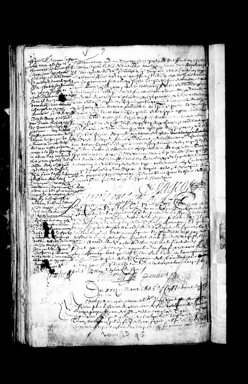 - Transcription du texte avec orthographe modernisée : «Du vingt-deuxième mars 1668, les assises tenant, le procureur fiscal présent. A comparu en sa personne Messire Jean Caignet, prêtre procureur et faisant pour les sieurs du séminaire de Saint-Sulpice de Paris, seigneurs propriétaires de l'île de Montroyal (Montréal) et terres en dépendant, lequel a dit et déclaré que les dits sieurs du Séminaire tiennent et rEtiennent en plein fief de la Compagnie des Indes Occidentales, seigneurs de ce pays, en tous droits de justice et seigneurie, la terre et seigneurie de Montréal consistante en toute l'étendue de la dite île et en deux lieues de terre de large le long du fleuve Saint-Laurent sur six lieues de profondeur à prendre du côté du nord où se décharge la rivière de L'Assomption dans le dit fleuve et à commencer à une borne qui d'un bout doit être mise à la distance de deux lieues de l'embouchure de la dite rivière de L'Assomption le [...]