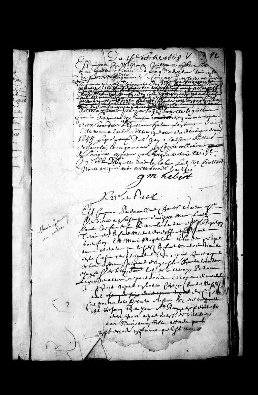- Transcription du texte avec orthographe modernisée : «Du 23e octobre 1668. Est comparu Par-devant Nous Charles Le Gardeur (Legardeur) écuyer Sieur de Villiers faisant pour demoiselle Marie Favery sa mère veuve de feu Pierre Le Gardeur (Legardeur) écuyer Sieur de Repentigny, tutrice des enfants mineurs de défunt Paul Godefroy. Et Marie Madeleine Le Gardeur (Legardeur), lequel avoue et déclare que les dits enfants mineurs tiennent en la censive des seigneurs de ce pays huit arpents de terre en roture, joignant d'un côté Charles Le Gardeur (Legardeur) écuyer Sieur de Tilly, d'autre le Sieur de Villeray, Par-devant la grande allée et par derrière le Cap aux Diamants (...) huit arpents en labour chargés envers nos dits "seigneurs" de cinq sol de cens portant lods & ventes, saisines etc (...) payable par chacun an au jour Saint-Rémi, chef d'octobre (...) dits huit arpents le dit Sieur de Villiers (...) Déclare n'avoir aucun titre attendu que (...) Est décédé en France et que les titres (...) S'étant rapporté pour le dit cent au titre du Sieur de Tilly et à sa déclaration en date du vingt-huit mars dernier, de laquelle déclaration, le dit Sieur de Villiers au dit nom Nous a requis acte à lui octroyé à la charge du payement du dit cent tant du passé que pour l'avenir au dit jour Saint-Rémi chef d'octobre, et a signé. Le Gardeur (Legardeur) Devillier L. T. Chartier »